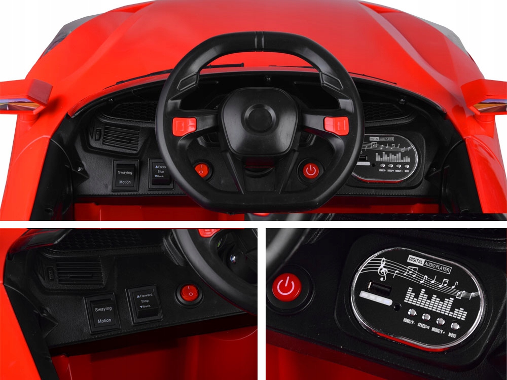 Автомобілем можна керувати за допомогою пульта дистанційного керування або дитина може керувати автомобілем самостійно, коли вона знає правила водіння. Автомобіль, призначений для найменших дітей, ідеальний як подарунок на день народження чи будь-який інший випадок. Новинка в автомобілі – ефект гойдання. Рух автомобіля плавний, а поступове прискорення не злякає навіть найменшу дитину. Завдяки 2 двигунам і 3 швидкостям автомобіль легко справляється з пагорбами, нерівностями або травою. В машині є гальмо, яке спрацьовує, коли ви знімаєте ногу з педалі газу. А також запобіжне гальмо на пульті STOP, завдяки якому батько матиме контроль над керуванням дитини. 3-швидкісний перемикач розташований на пульті дистанційного керування, а перемикач переднього та заднього ходу — на кабіні. Під час руху автомобіль горить, а під кермом є кнопка, яка приховує звук клаксона і звук клаксона. Ви також можете підключити власний MP3-плеєр в машині, щоб ваша дитина під час руху слухала улюблені пісні, казки і т. д. Професійний автомобіль для маленького Смика.