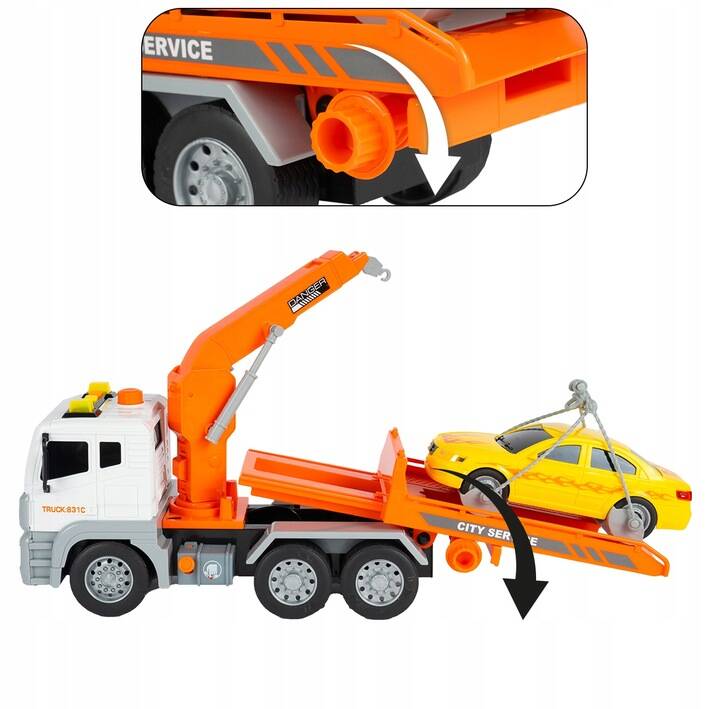 Автомобіль видає такі звуки, як запуск двигуна, натискання на газ, а також пісні! Обидві машини - і евакуатор, і автомобіль - можуть рухатися вперед і назад! Двоколісні, гоночники, позашляховики і вантажівки з цінними вантажами - це те, що найбільше потрібно справжньому любителю двох або чотирьох коліс! Тепер він зможе рятувати машини, які зламалися і потребують допомоги механіка. Чудова іграшка з багатьма можливостями для годин веселощів!