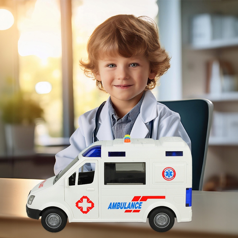 Іграшкова машина швидкої допомоги має два інтенсивно сяючі світлодіодні ліхтарі на даху, які додають розваг реалістичності.