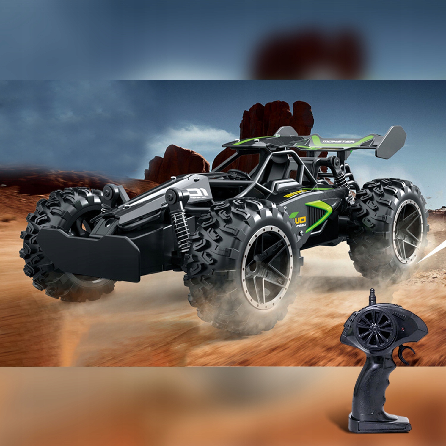Завдяки своєму потужному двигуну та великим колесам цей фантастичний автомобіль із радіокерованим керуванням може легко їхати вперед, назад, повертати ліворуч чи праворуч і долати складну місцевість. Він легко пройде через пісок, дрібне каміння, дороги або низьку траву. Ідеально підходить для гри як у приміщенні, так і на вулиці.