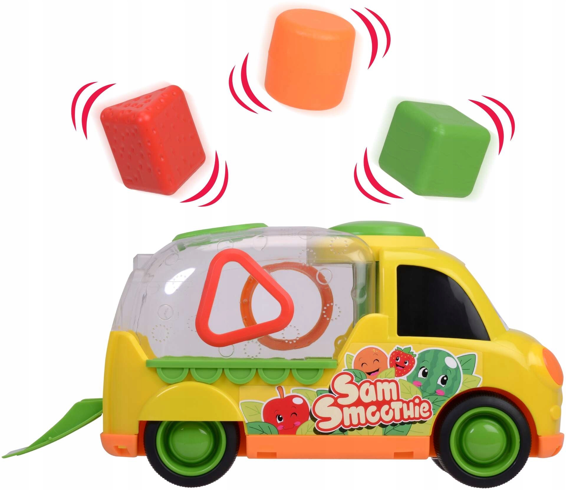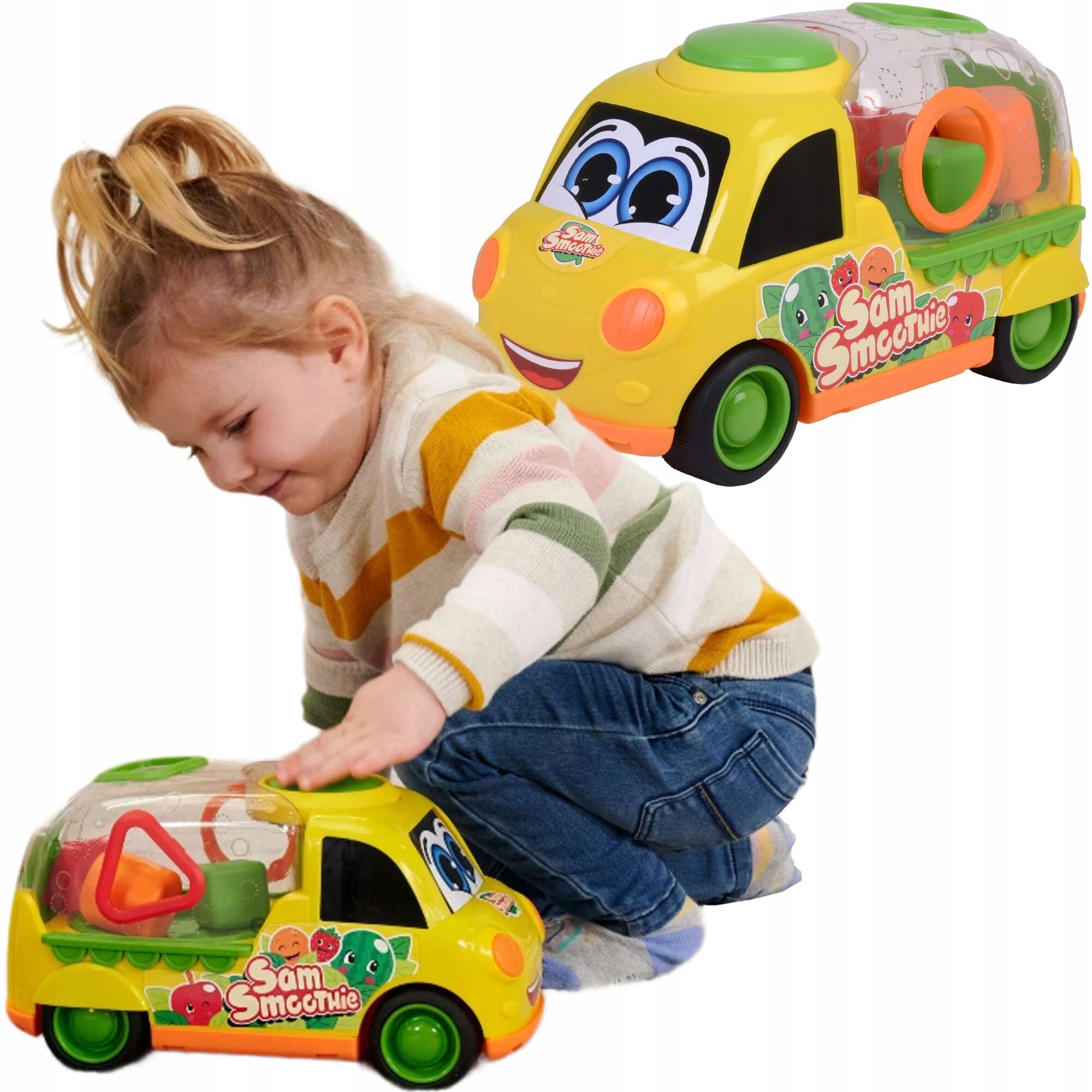 Центр автомобіля - сортер, а в набір входять3 блоки різної форми. Просто вставте блок в отвір і натисніть велику зелену кнопку на даху автомобіля.