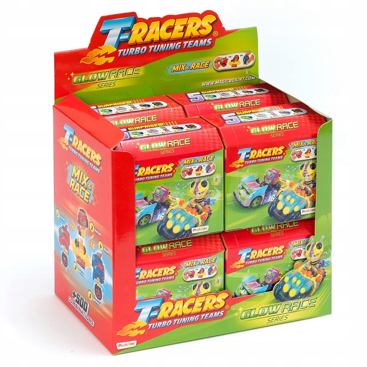 T-Racers повертаються в новій серії Glow Race! Відкрийте для себе 8 нових колекційних драйверів, нові деталі та їхні сили та... величезну кількість комбінацій! Пам'ятайте, що всі частини автомобіля взаємозамінні з іншими T-Racer: передня, задня, центральна частина автомобіля, колеса та ведучі. Чи зможете ви знайти надрідкісного персонажа на ім’я Доктор Глоу? Він злегка світиться в темряві!
