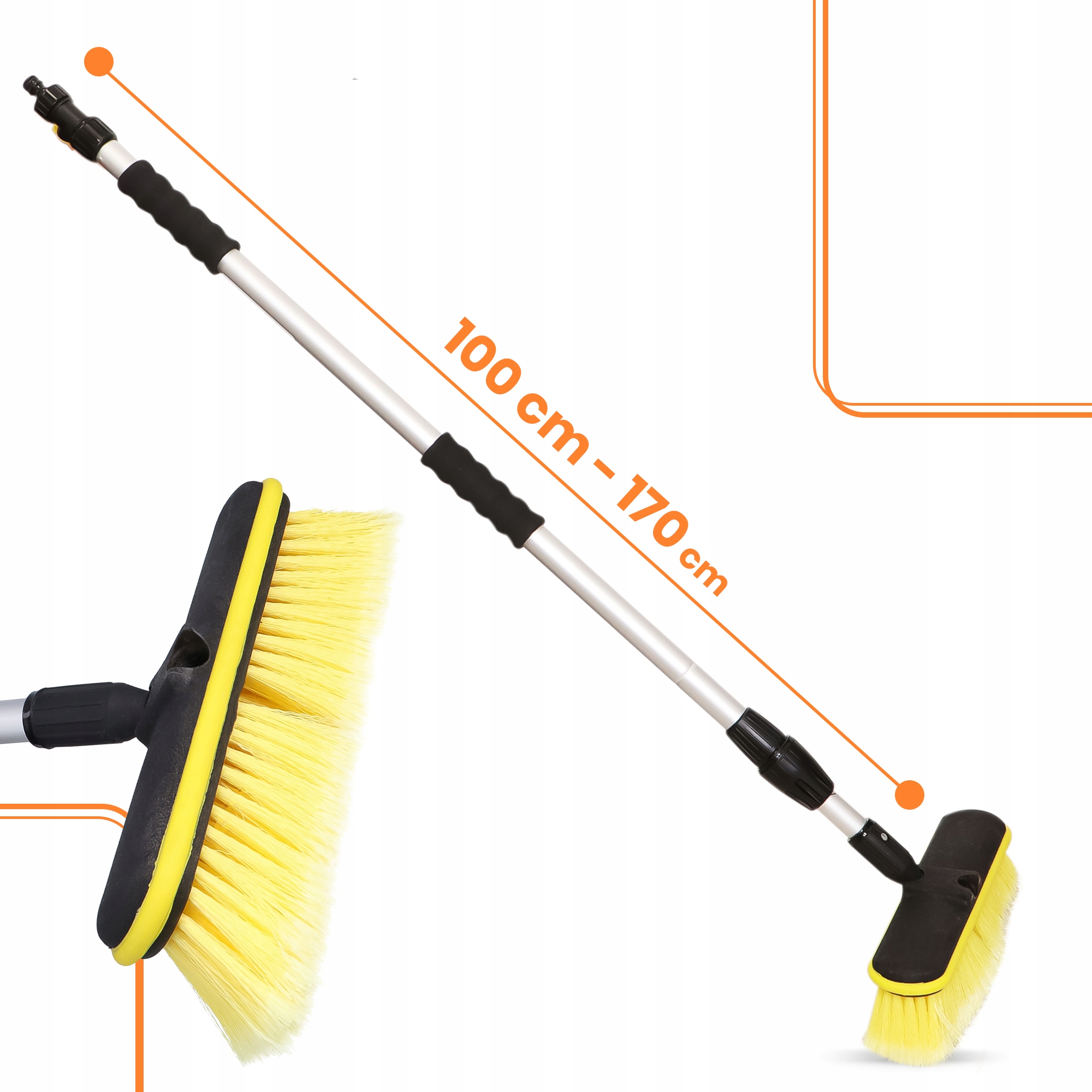Регулятор потоку води дозволяє точне управління потоком, а кінець соска дозволяє швидко підключитися до шланга . Кисть ідеально підходить для очищення тіла та скла в вантажівках, автобусах, човнах та інших високих поверхнях, гарантуючи продуктивність та комфорт роботи.