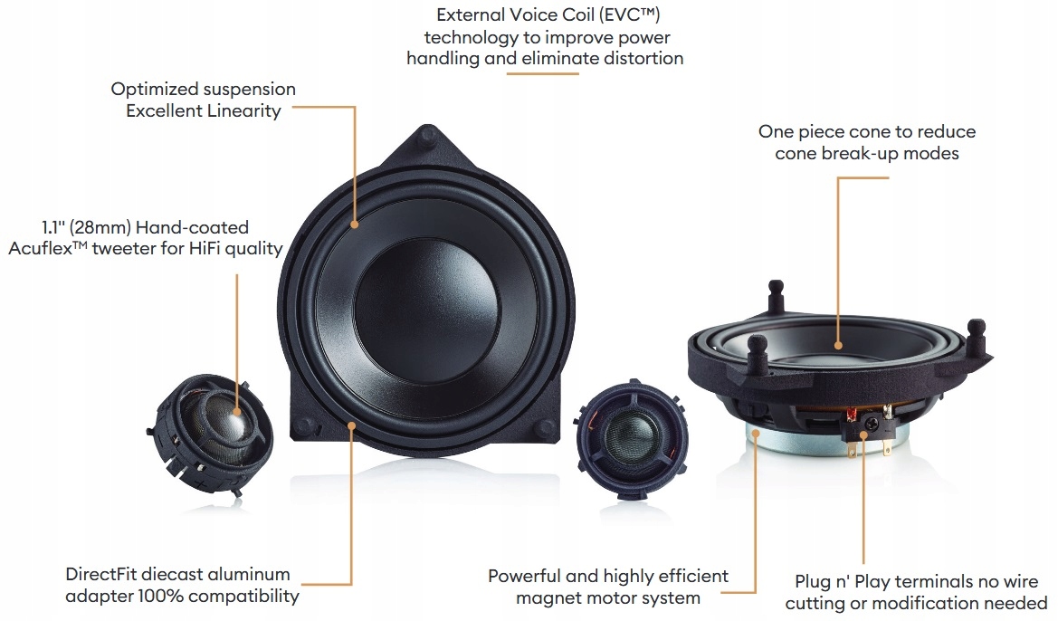 У середньочастотному динаміку використовується високоякісний феритовий магніт, який створює сильніший магнітний потік, що забезпечує вищу потужність і ефективність динаміка. При цьому габаритні розміри цього магніту на 35% менше стандартних феритових магнітів, що зменшує глибину установки. Час і зусилля, витрачені на відповідне профілювання діафрагми НЧ-динаміка, призводять до точного відтворення частоти середніх низьких частот, зменшення спотворень і покращення динаміки.