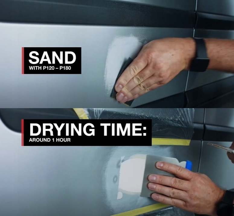 2️⃣ Після висихання (приблизно 2 години при 20°C) вирівняйте поверхню наждачним папером (зернистість 800 у вологому стані).