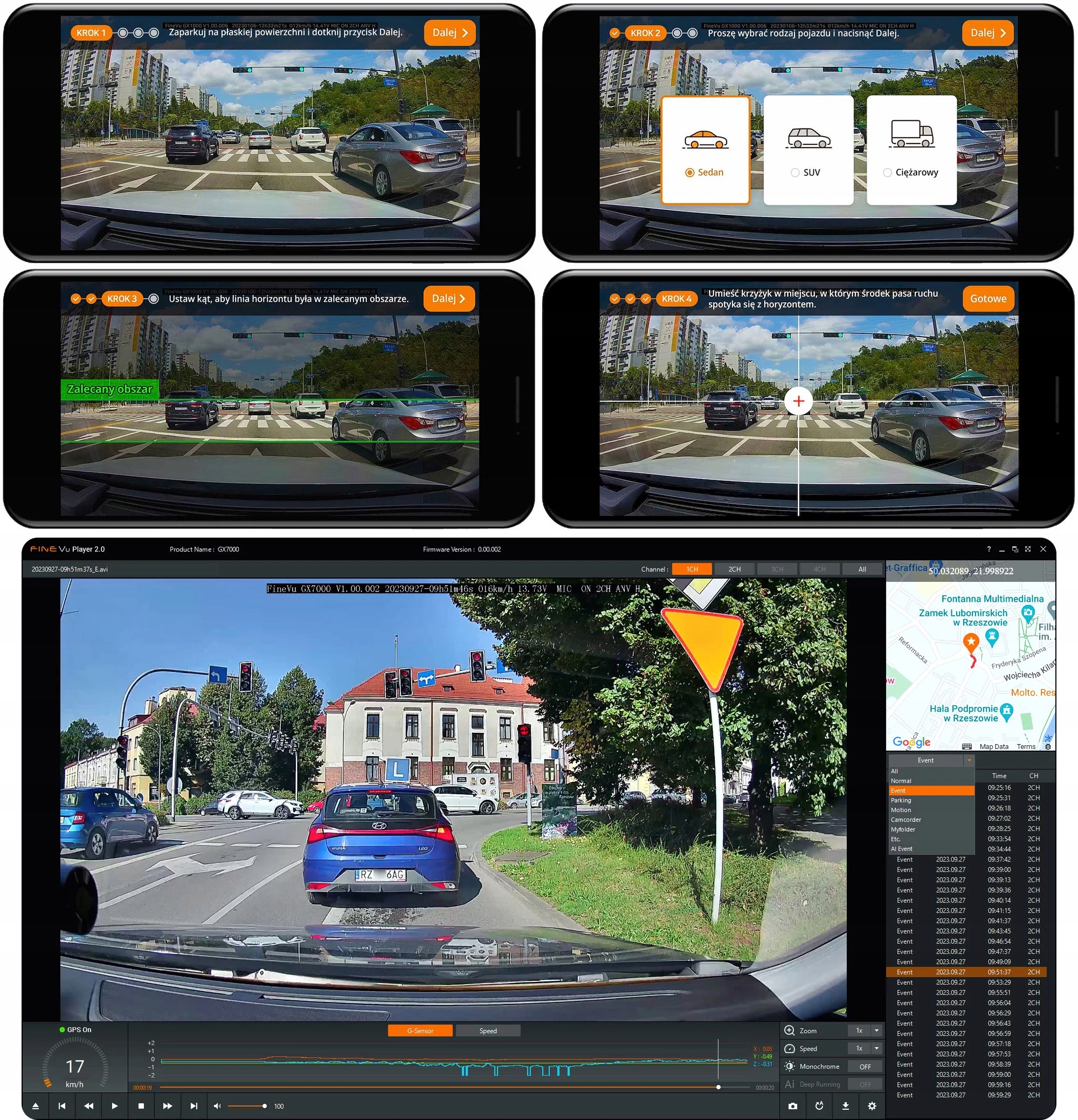 Безкоштовна комп’ютерна програма FINEVU PLAYER, доступна для завантаження на веб-сайті виробника, дозволяє зручно переглядати записи, аналізувати події та маршрути подорожей, читати дані GPS та експортувати вибрані фрагменти відео з обох камер.