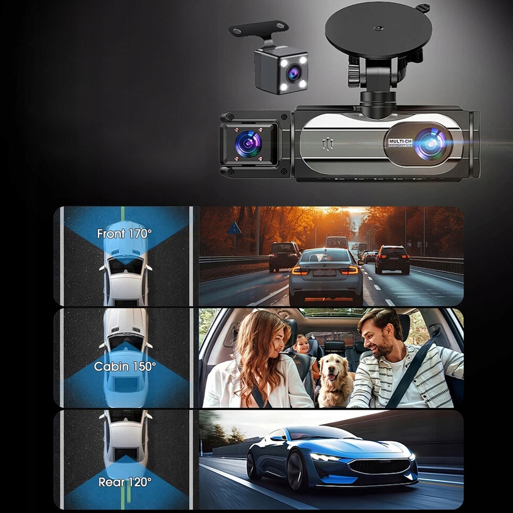 Цей 3-канальний реєстратор оснащений ширококутною передньою камерою 170°, внутрішньою камерою 150° та водонепроникною задньою камерою 120° для зменшення сліпих зон. Екран IPS забезпечує чітке зображення без розмиття під будь-яким кутом.