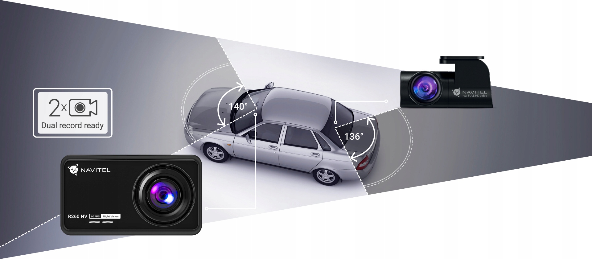Відеодрекорю Navitel R260 NV сумісний із повною задньою камерою HD від Navitel, яку можна придбати окремо*. друге.