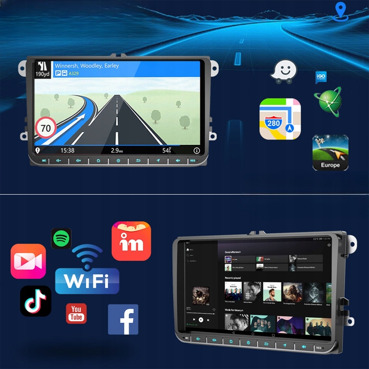 Радіо має GPS -приймач. Для навігації ви можете використовувати будь -яку вибрану програму з голосовими командами польською мовою, такими як Google Maps, Yanosik або Numptempte Internet. Грайте, відтворюйте музику з YouTube, Spotify і навіть запишіть назад у повідомлення Facebook. Одним словом, всі програми, доступні для мобільних телефонів та планшетів, можна завантажити на радіо. > Радіо має чотириядерний процесор, 1 ГБ оперативної пам’яті та 32 ГБ внутрішньої пам'яті. Використовується на радіо - Той самий матриця, що і в смартфонах, планшетах та високих ноутбуках. Дисплей, виготовлений із загартованого скла на відміну від дешевших моделей з пластиковим екраном радіо виглядає ексклюзивним