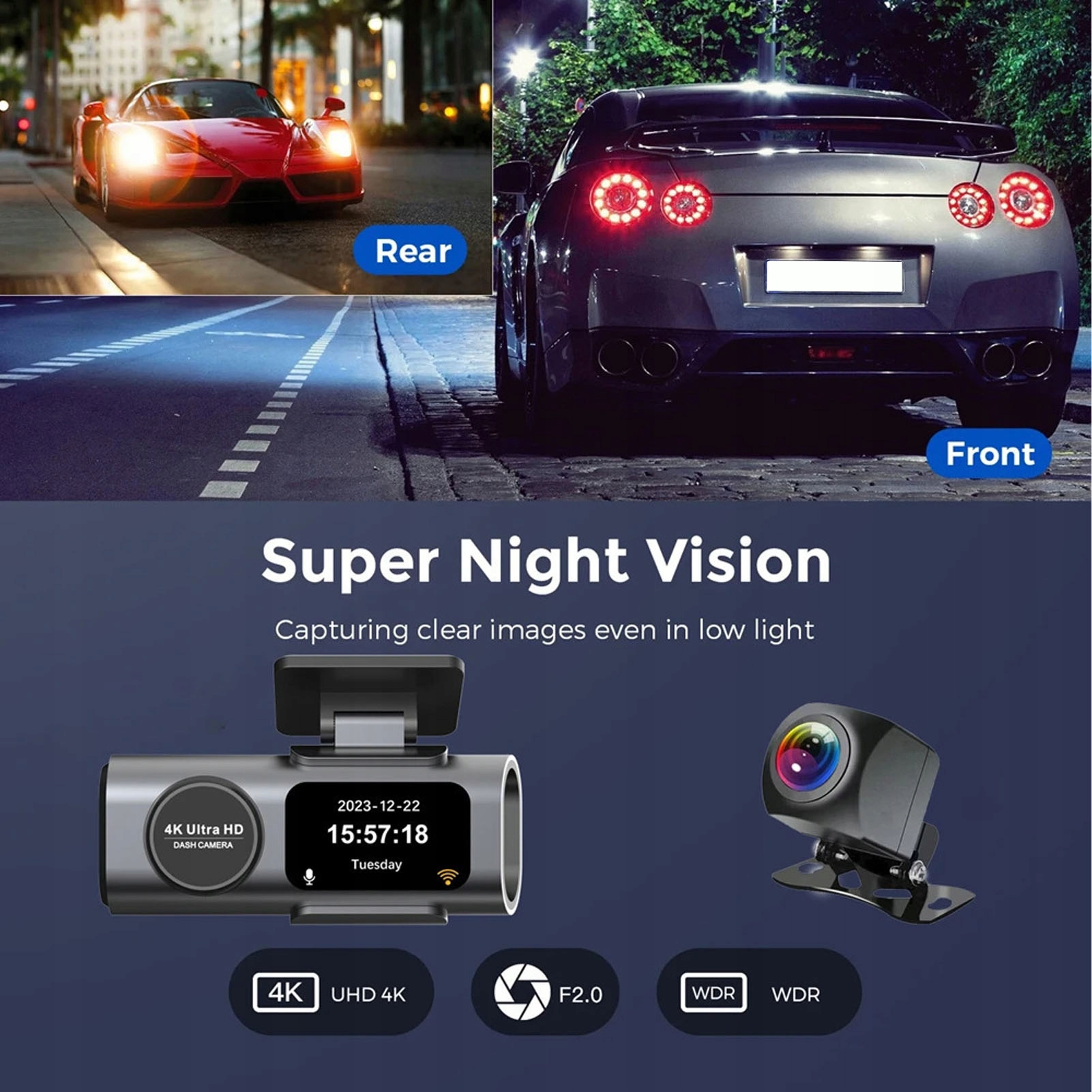 1. Запис передньої та задньої подвійної камери. Ця камера приладової панелі автомобіля використовує подвійні передню та задню камери 4K та 1080P для забезпечення повного відеоспостереження HD для захисту безпеки під час запису кожного моменту чудового водіння.