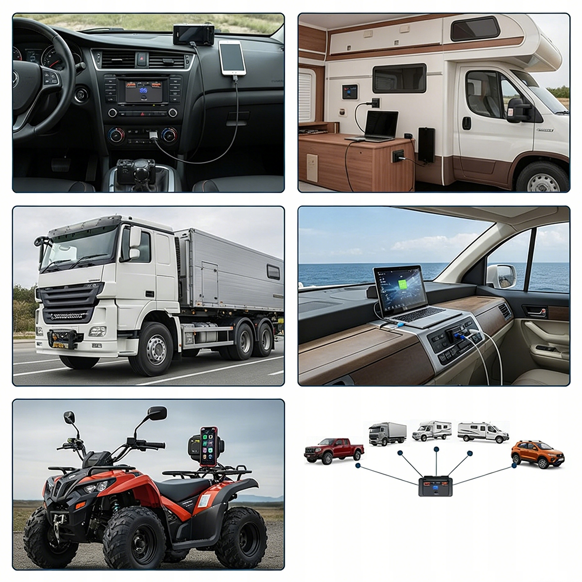 Підходить для транспортних засобів 12-24 В, таких як фургони, човни, квадроцикли, вантажівки тощо. Може живити мобільні телефони, комп’ютери, камери та інші електронні пристрої.