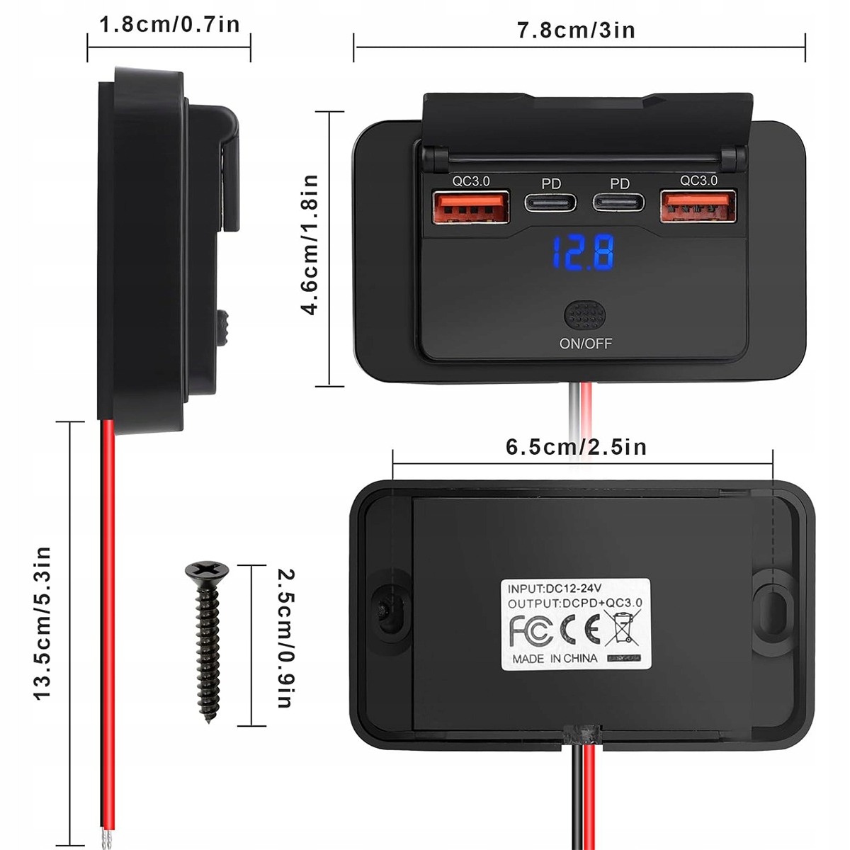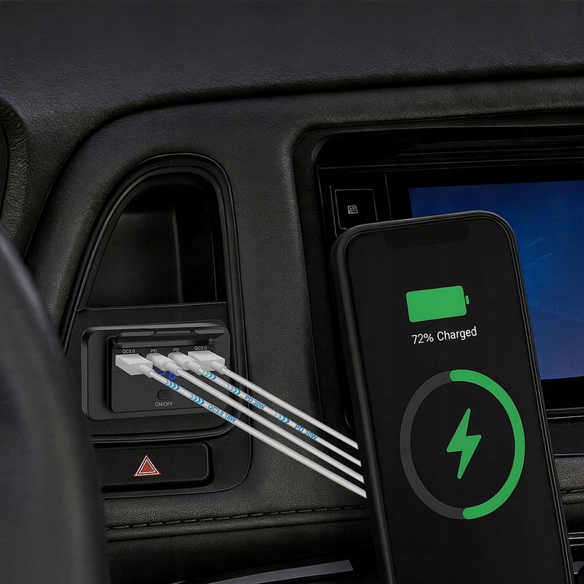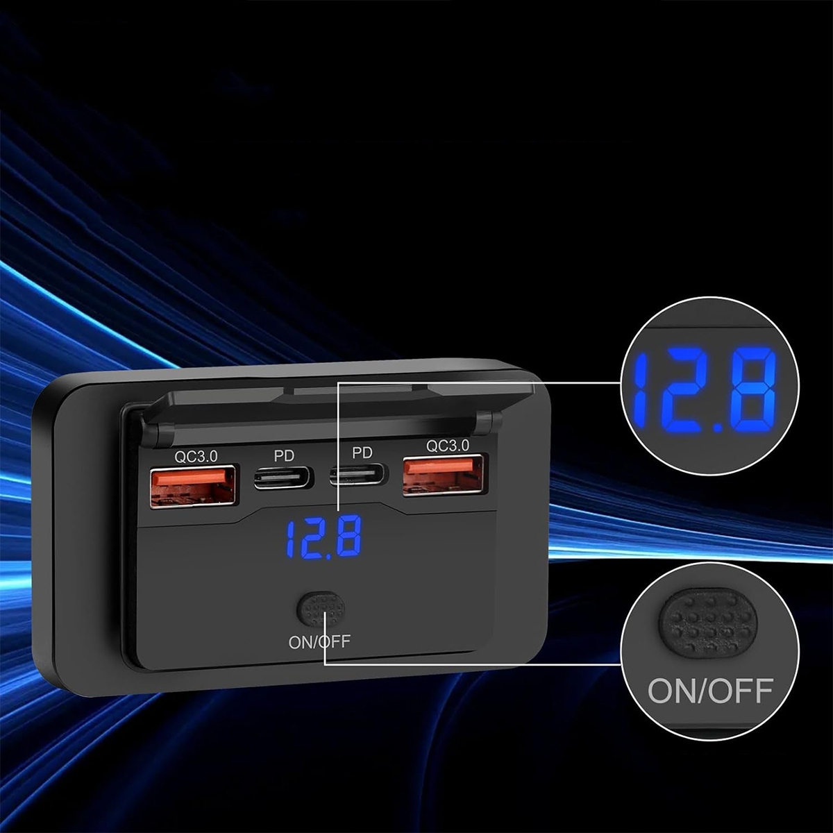 Це USB-роз’єм на 12 В оснащено двома портами USB A потужністю 18 Вт і двома портами USB C потужністю 30 Вт, що дозволяє швидко заряджати до 4 пристроїв одночасно