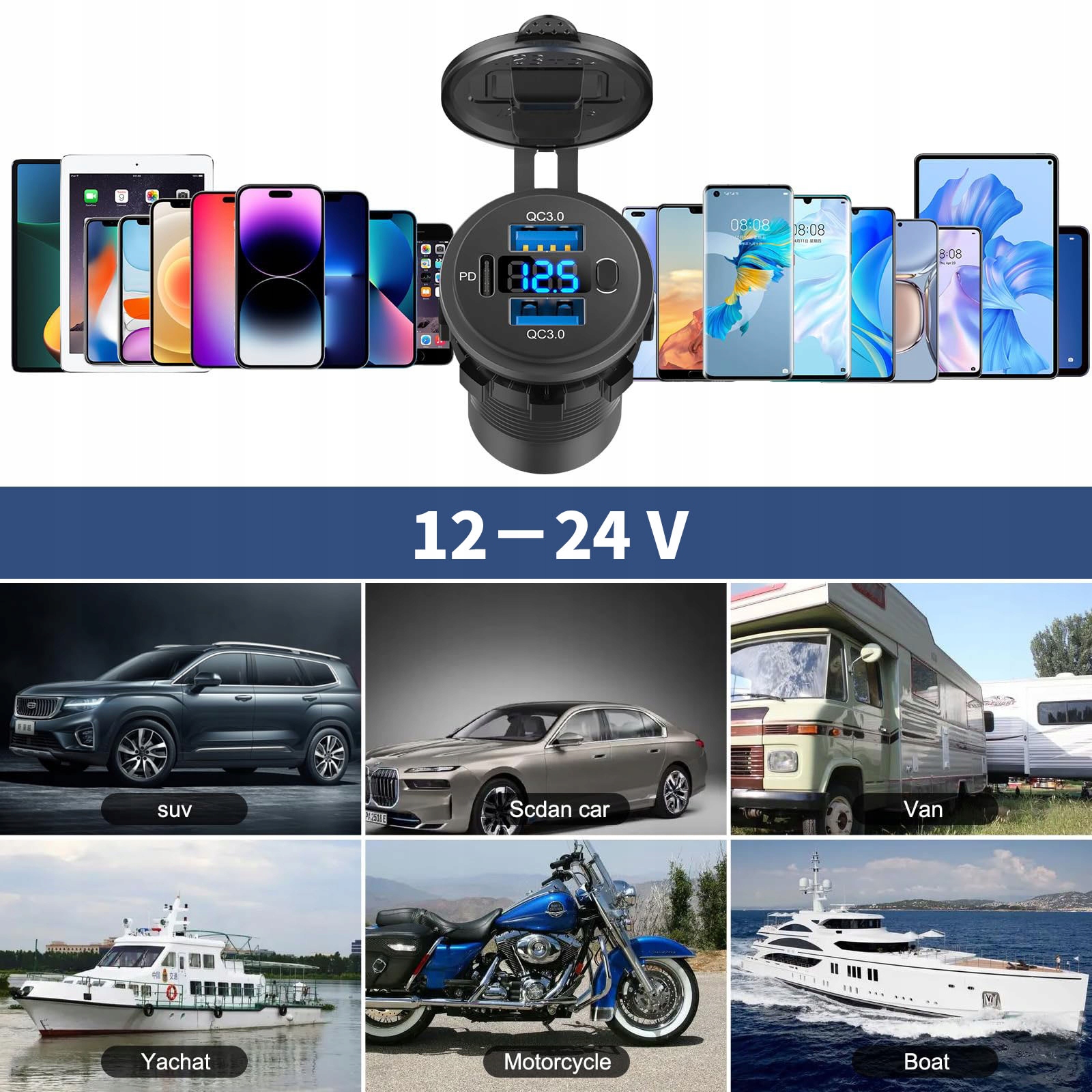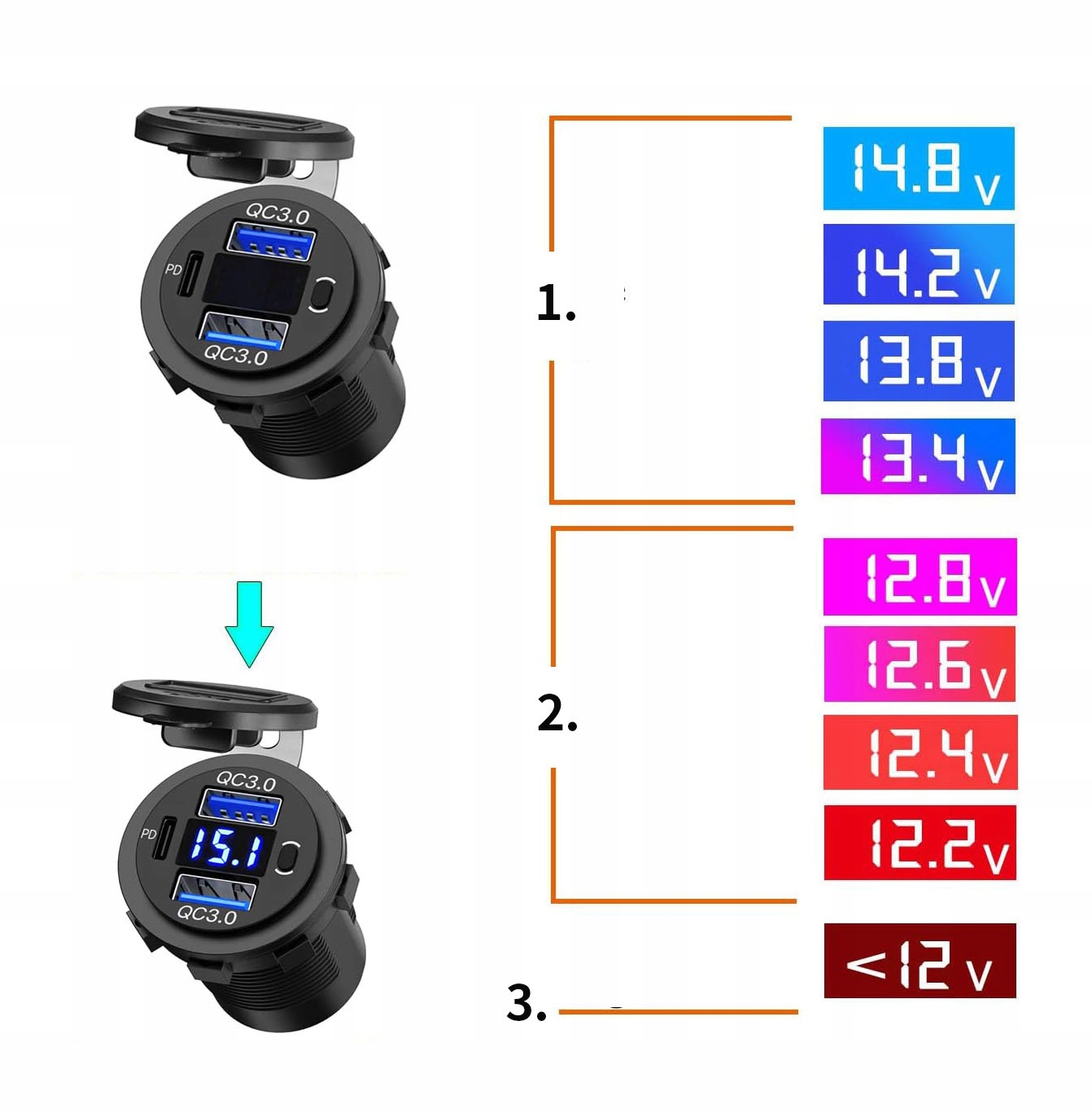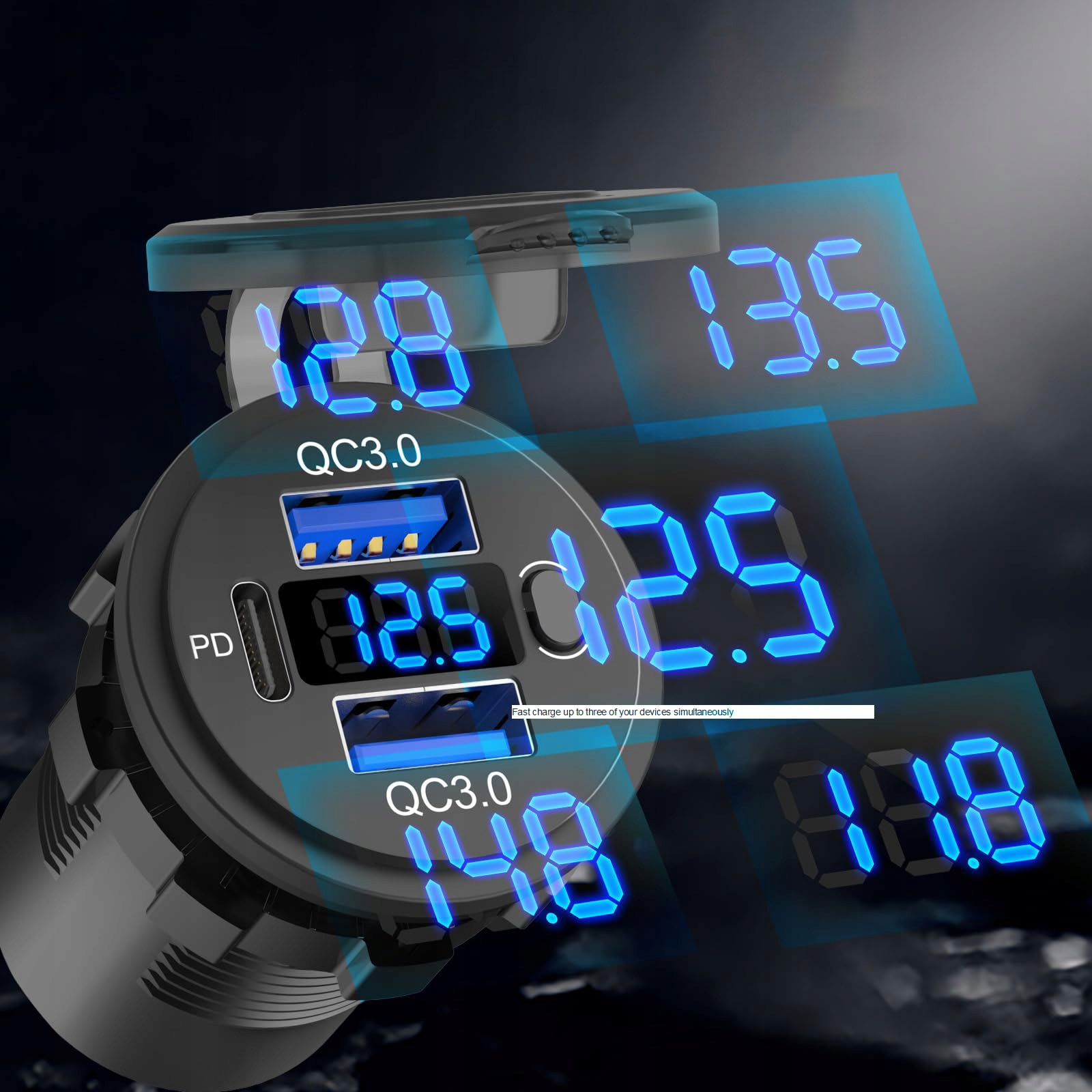 Автомобільна розетка USB 2 QC 3.0 PD ВОЛЬТМЕТР 12 В 24 В IP65 Перемикач 66 Вт
