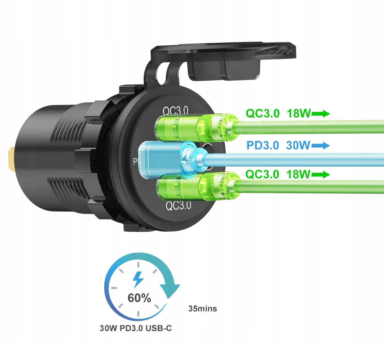 - USB-зарядний пристрій із трьома USB-роз’ємами (2 x USB QC 3.0 + PD) із вимикачем.