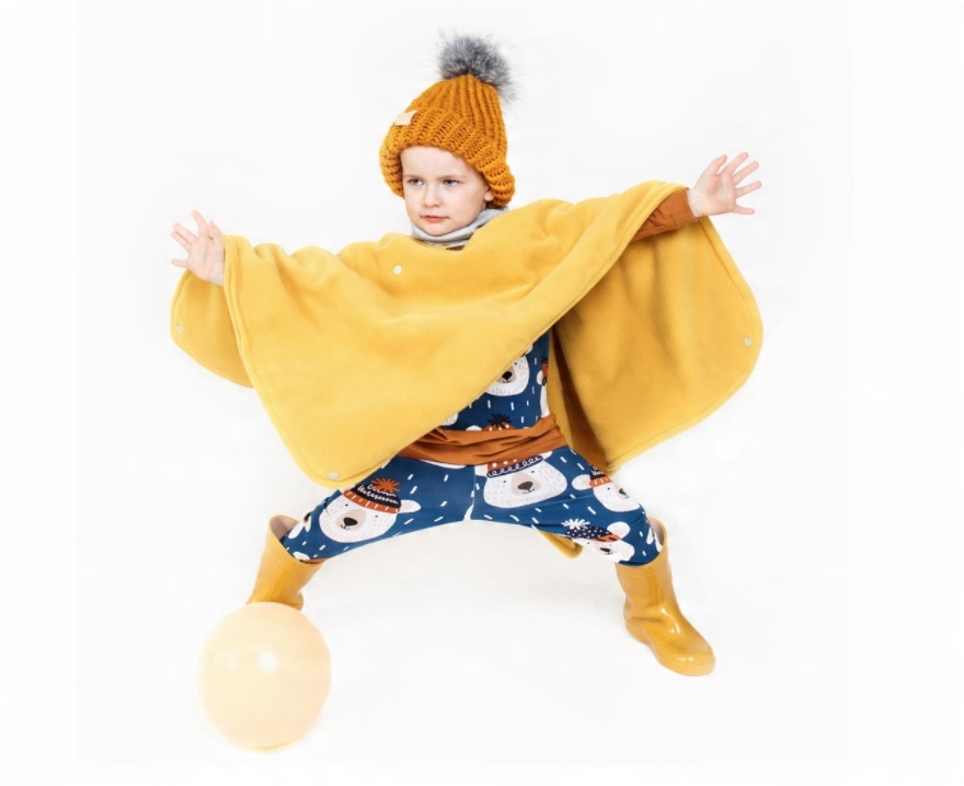 Пончо стандартного розміру виготовлені з приємного та м’якого на дотик флісу, який забезпечує тепловий комфорт при відносно невеликій вазі. Практичне пончо із застібкою з одного боку, а також водолазка на блискавці на шиї полегшує одягання та зняття як для однорічної, так і для трирічної дитини. річна дитина. Водолазка виготовлена з 97% бавовни та 3% еластану.