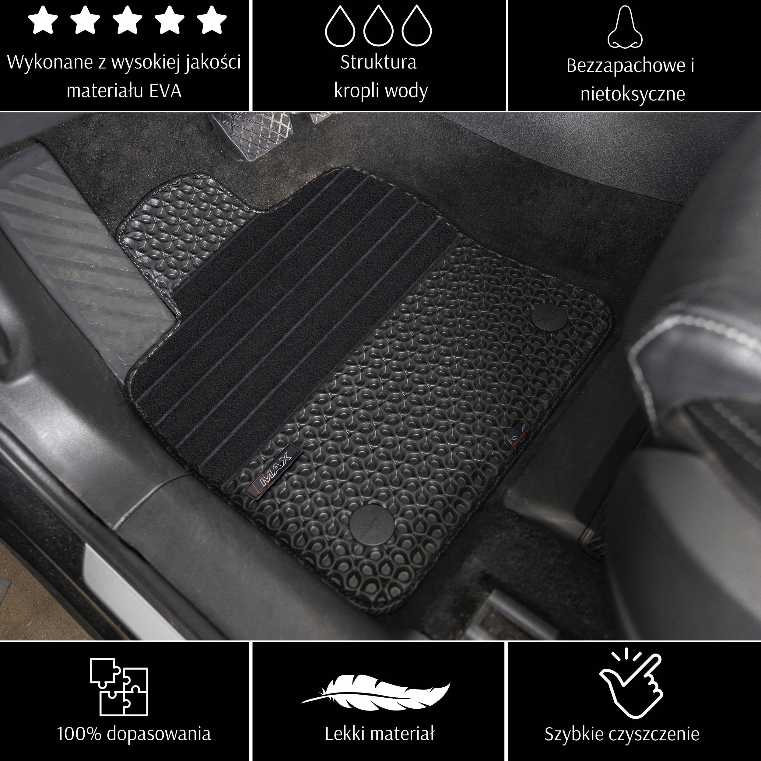 Автомобільні килимки EVA line виробництва польської компанії Max-Dywanik являють собою цільний продукт товщиною 10 мм, який характеризується унікальним ромбовим малюнком. Крім того, водійський килимок був стійкий до стирання шляхом зміцнення зони, призначеної для водія, що значно підвищує його довговічність. На килимках ми розмістили силіконові емблеми MAX.
