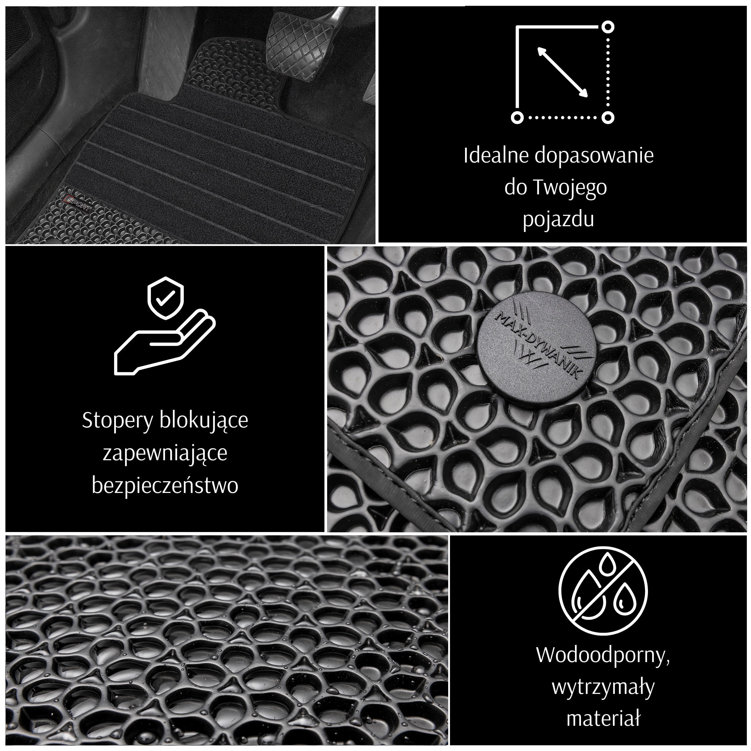 Автомобільні килимки EVA line виробництва польської компанії Max-Dywanik являють собою цільний продукт товщиною 10 мм, який характеризується унікальним ромбовим малюнком. Крім того, водійський килимок був стійкий до стирання шляхом зміцнення зони, призначеної для водія, що значно підвищує його довговічність. На килимках є гелеві емблеми SPORT, розроблені MAX-DYWANIK, які підкреслюють зовнішній вигляд килимків.