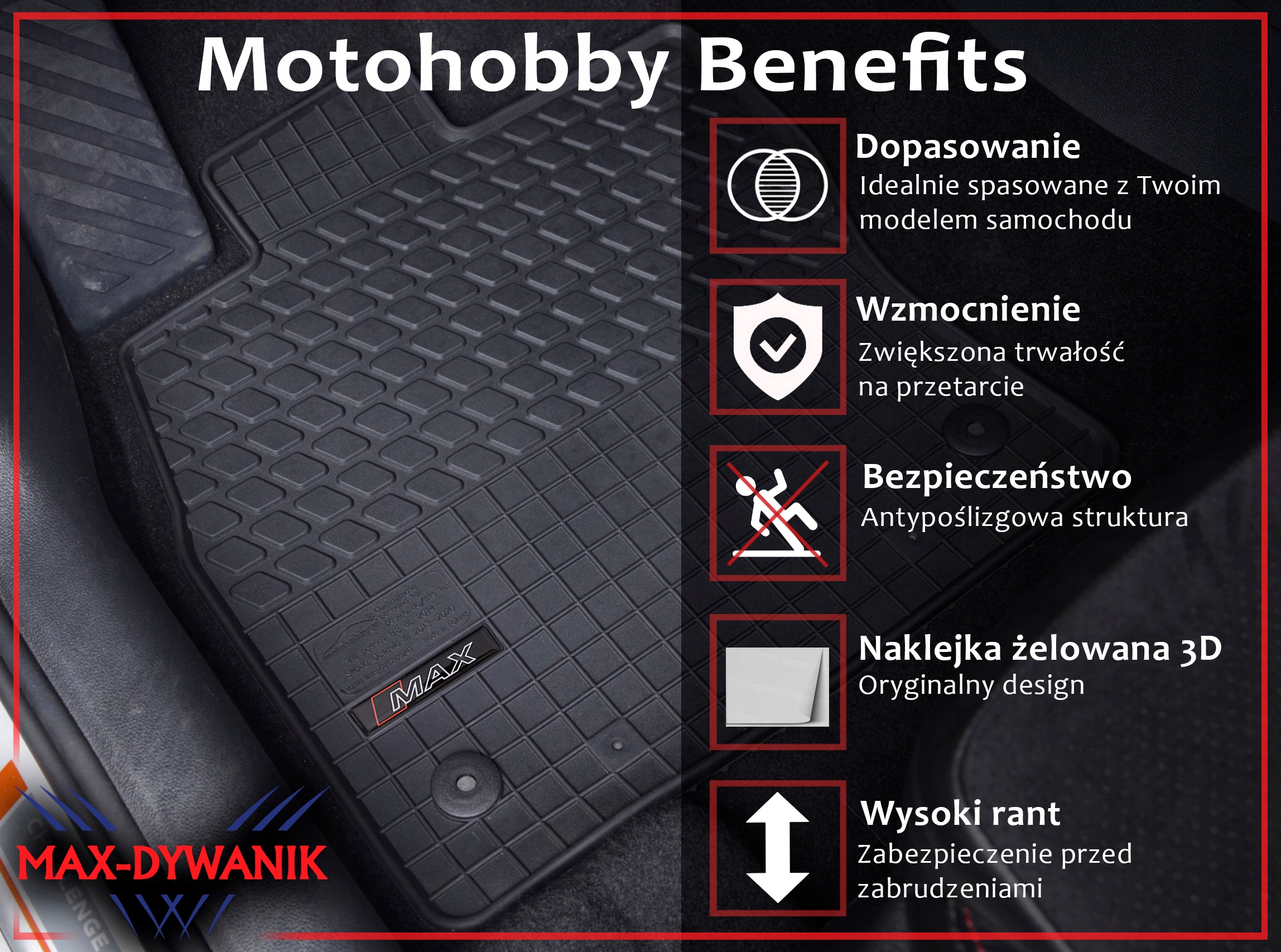 Килимки MOTOHOBBY® — ідеальне рішення для вашого автомобіля. Створені, щоб ідеально вписатися в салон вашого автомобіля, вони забезпечують комфорт під час подорожі. Оснащені делікатною кромкою висотою 1 смвони виконують захисну функцію, ефективно запобігаючи потраплянню бруду та вологи на оббивку.