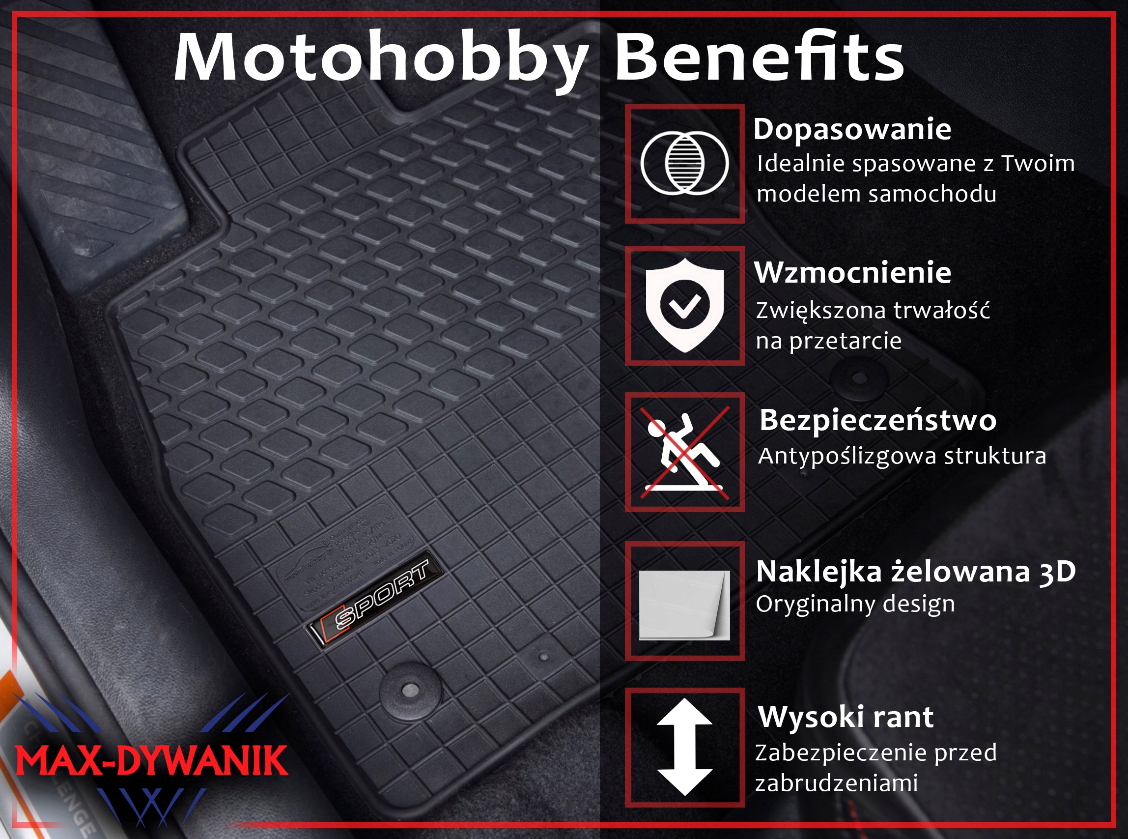 Килимки MOTOHOBBY® — ідеальне рішення для вашого автомобіля. Створені, щоб ідеально вписатися в салон вашого автомобіля, вони забезпечують комфорт під час подорожі. Оснащені делікатною кромкою висотою 1 смвони виконують захисну функцію, ефективно запобігаючи потраплянню бруду та вологи на оббивку.