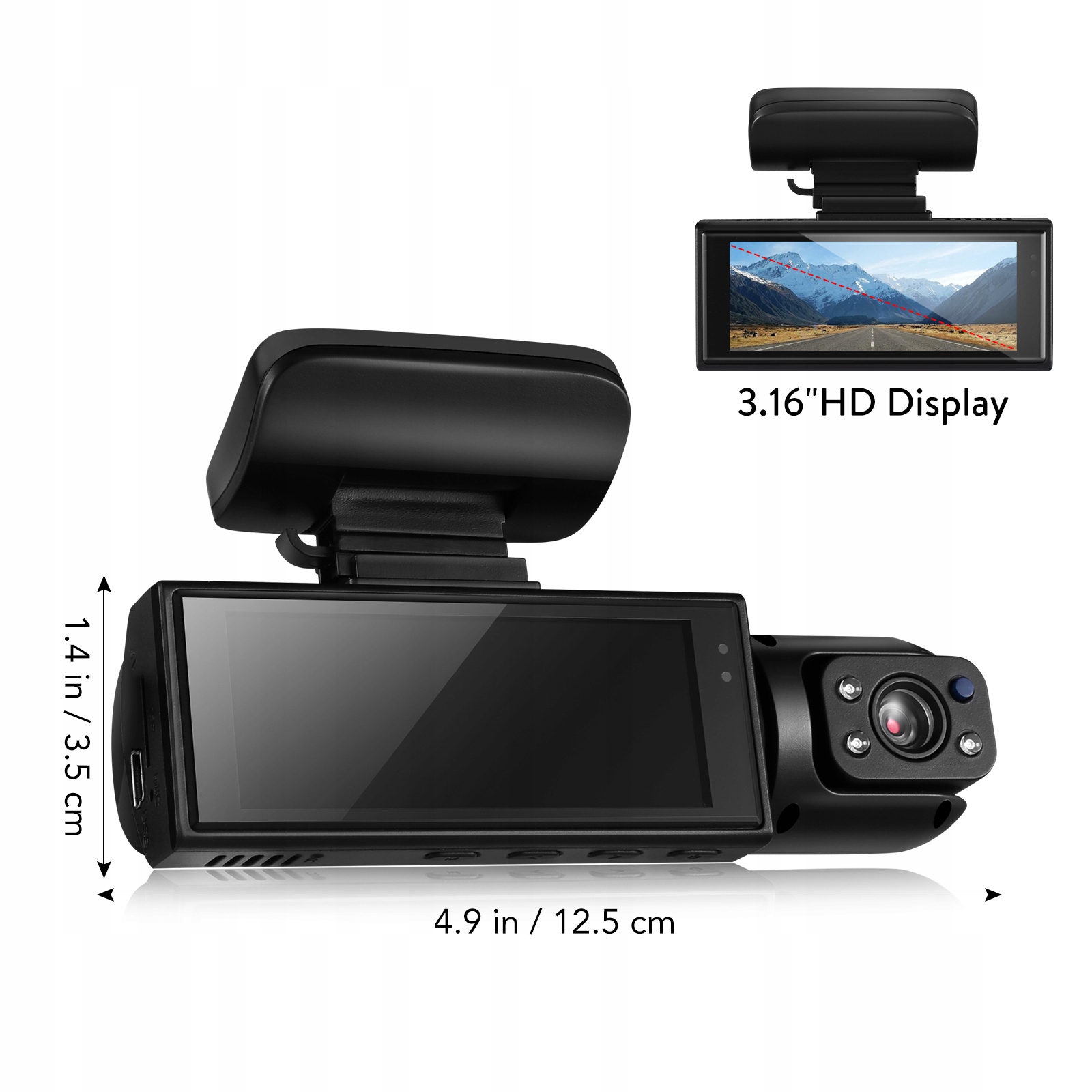 Ця автомобільна камера оснащена двома камерами, один може записати передню частину автомобіля, а другий - інтер’єр автомобіля.