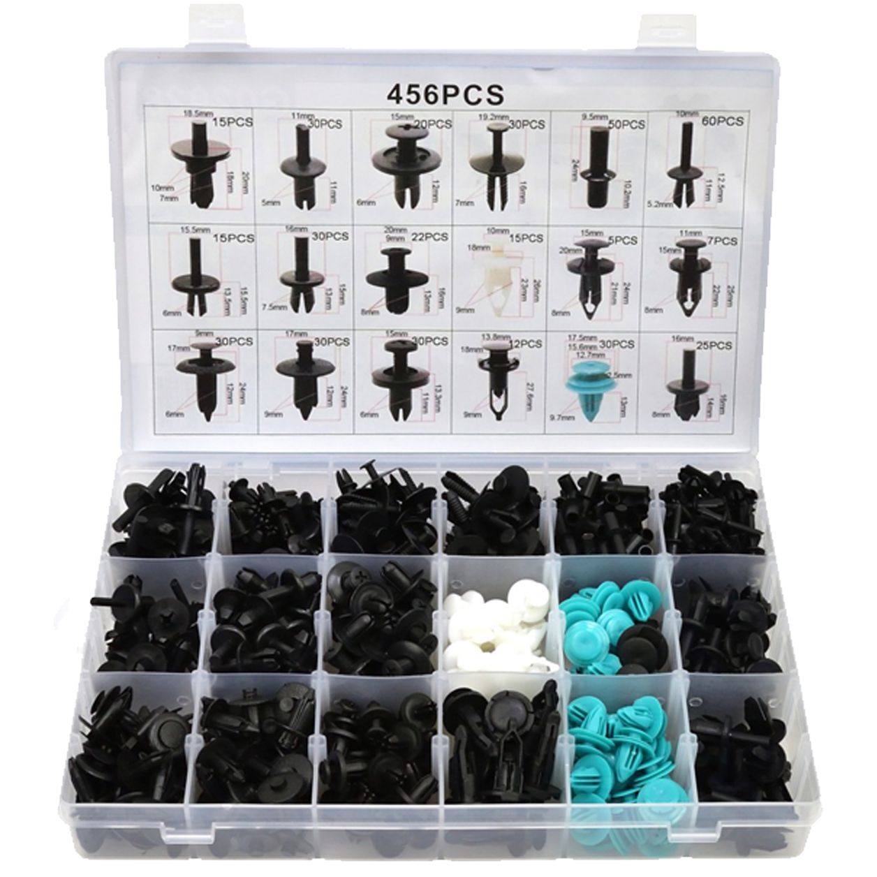 Великий набір затискачів, розширювальних і монтажних штифтів, які використовуються в усіх найпопулярніших марках автомобілів. Набір складається з 456 деталей.