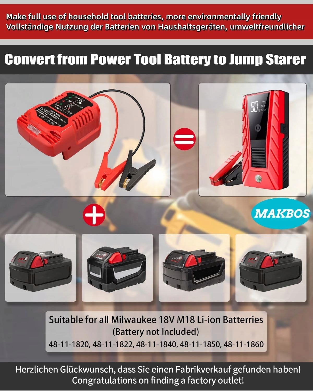Адаптер Power Bank для автомобільного пускового пристрою для батареї Milwaukee 18V M18, пускові пристрої для автомобільного акумулятора, стрибковий стартер, портативний акумуляторний підсилювач 12 В, безпечний акумуляторний стартер (батарея не входить до комплекту)