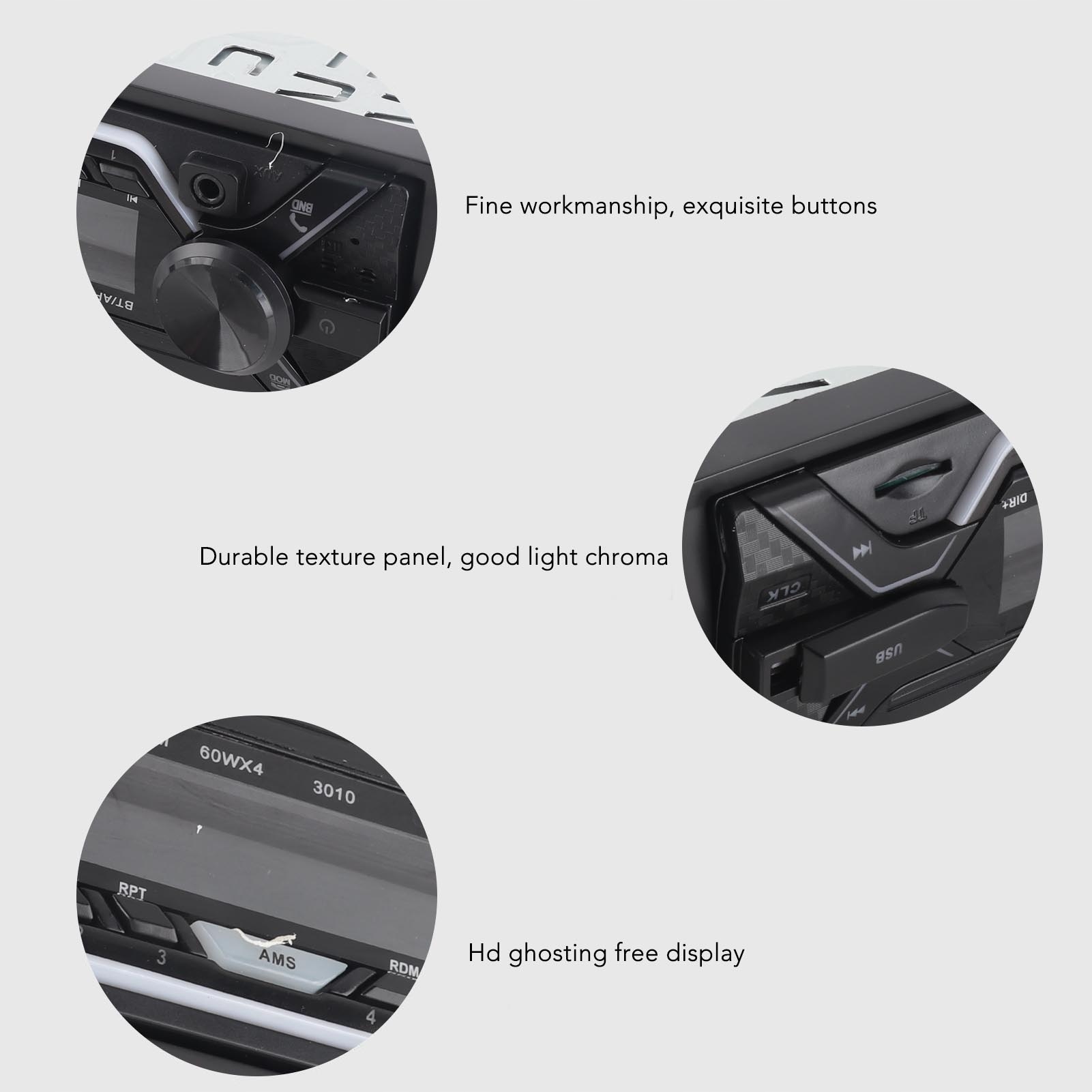 3. Стереозвук: автомобільний програвач має чотириканальний вихід на передній, задній, лівий і правий канали, із звуковим сигналом, що забезпечує приголомшливу якість звуку. Конструкція з одним литником ефективно зменшує шум автомобіля, покращує музичні враження.