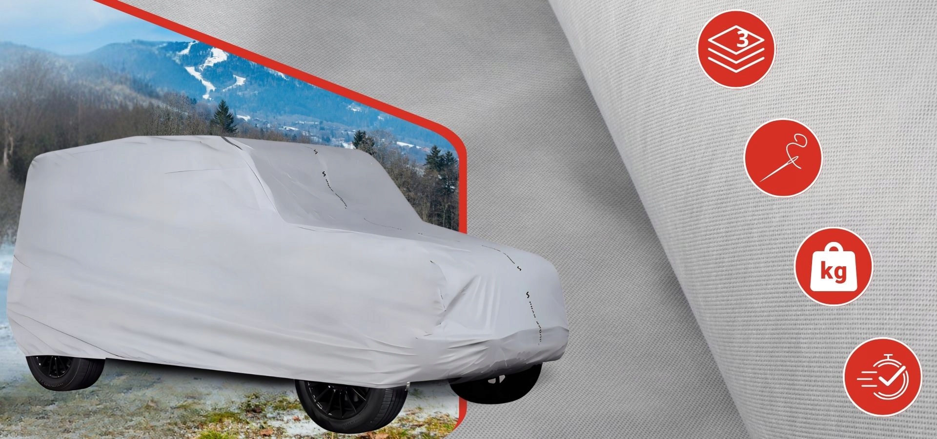 Верхня частина чохла виконана з 3-шарового матеріалу: двошаровий спанбонд з додатковим покриттям. Зовнішній шар попелястого кольору з водонепроникними та паропроникними властивостями призначений для захисту від погодних умов, таких як: дощ, сніг, мороз, УФ-випромінювання.