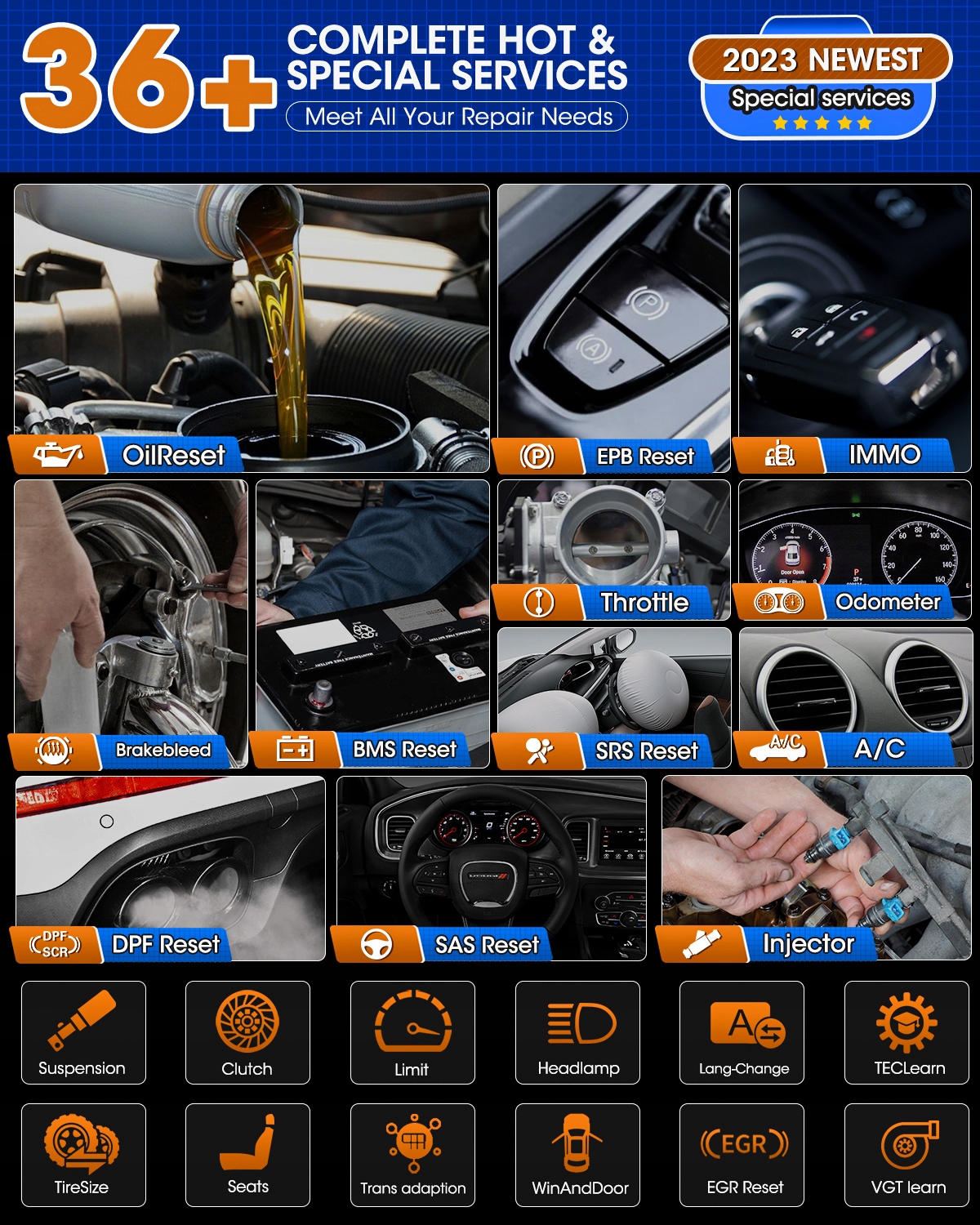 Підтримувані системи: ABS, DPF, EPB, SAS, SRS, двигун/коробка передач, коробка передач, дросель, інжектор, скидання масла/BMS, ключі IMMO, підвіска, прокачка гальм/трансформація, розмір шин CHG, TEC, фара/WIN DR POO, сидіння, циліндр