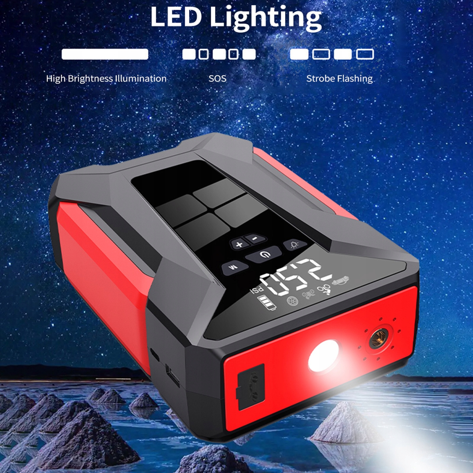 4. Потужна пускова потужність автомобіля: незалежно від того, керуєте ви невеликим седаном, мотоциклом, позашляховиком або пікапом, цей пусковий пристрій і повітряний насос можуть миттєво запустити бензинові транспортні засоби на 12 В без будь-яких обмежень розміру двигуна. Будьте готові до несподіваних надзвичайних ситуацій і насолоджуйтеся спокоєм у дорозі з цим потужним пристроєм.