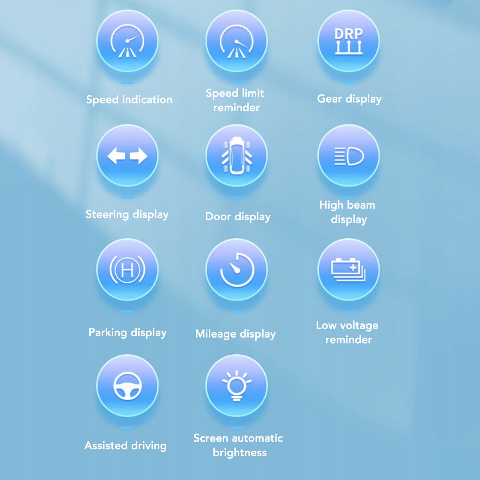 4. Багатофункціональне використання: дисплей спідометра HUD відображає не лише швидкість, але й інші функції, такі як відображення часу, відображення температури, положення передачі, відображення тиску в шинах, інформацію про вказівник повороту, нагадування про ремінь безпеки, відстань, попередження про обмеження швидкості, інформацію про дверний вимикач, інформацію про освітлення тощо.