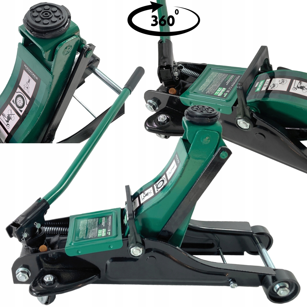 Завдяки правильно розробленим колесам цей домкрат можна легко встановити в будь-якій точці під автомобілем. Їх конструкція значно полегшує маневрування цим інструментом. Їх великий діаметр дозволяє легко керувати підйомником навіть на нерівних поверхнях.