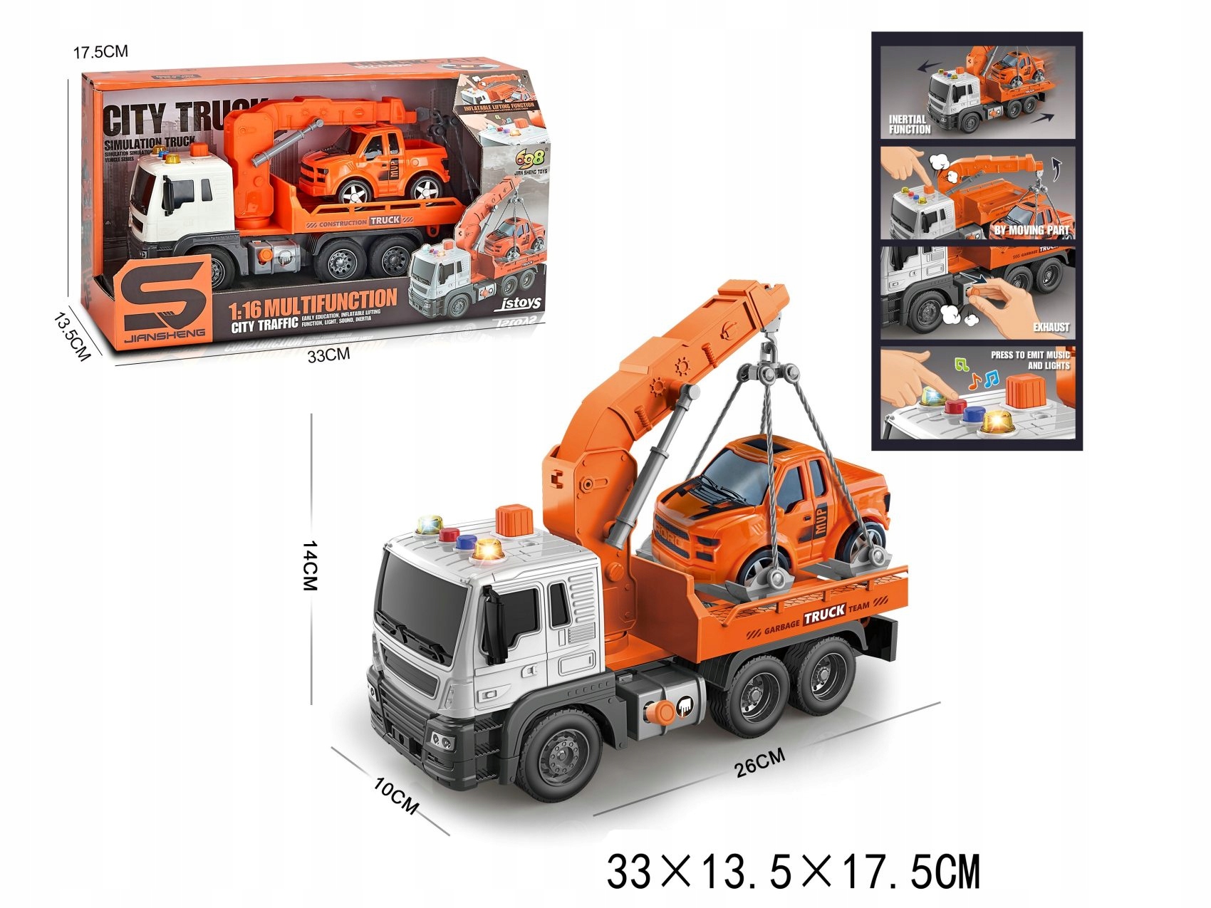 Евакуатор світиться і видає різні звуки.Іграшка має додаткову функцію підйому і опускання кабіни. Ідеальна іграшка для маленьких любителів автомобілів.