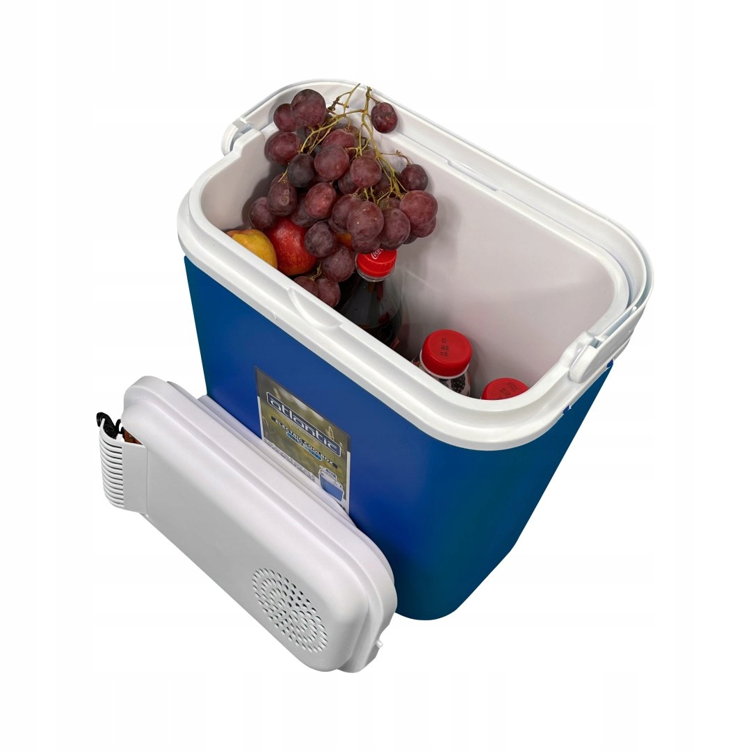 Компактний портативний туристичний холодильник об'ємом 18 л, живиться від автомобільного прикурювача 12 В.