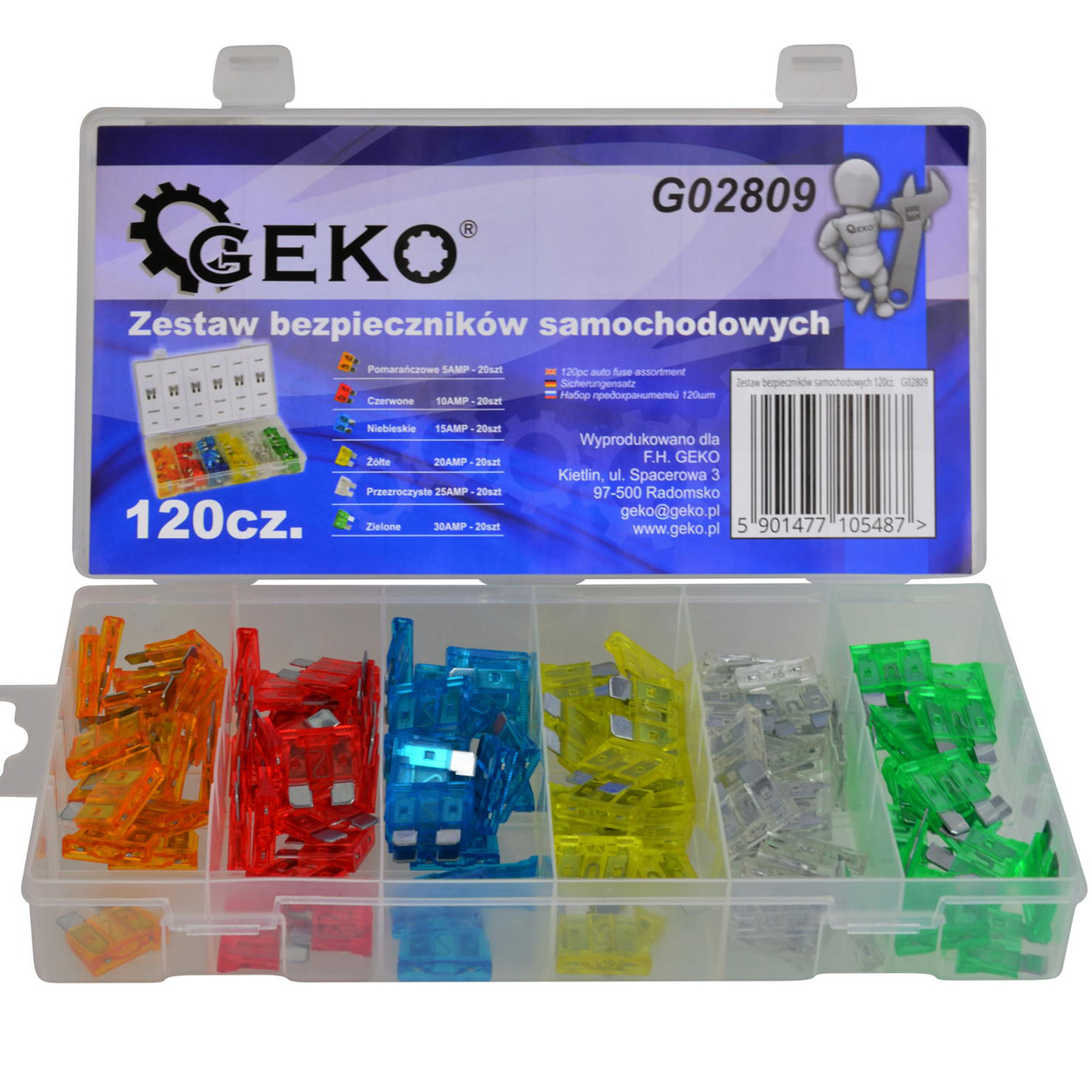 Набір із 120 мініпластинчастих автомобільних запобіжників на силу струму від 5A до 30A.