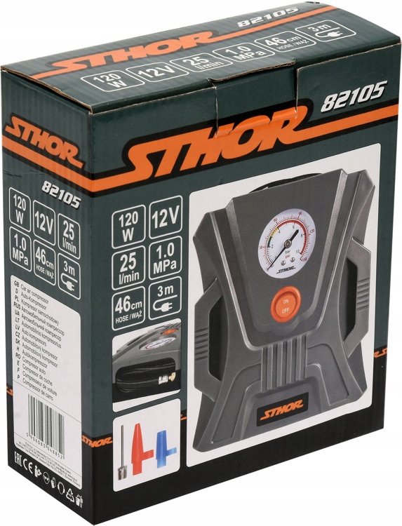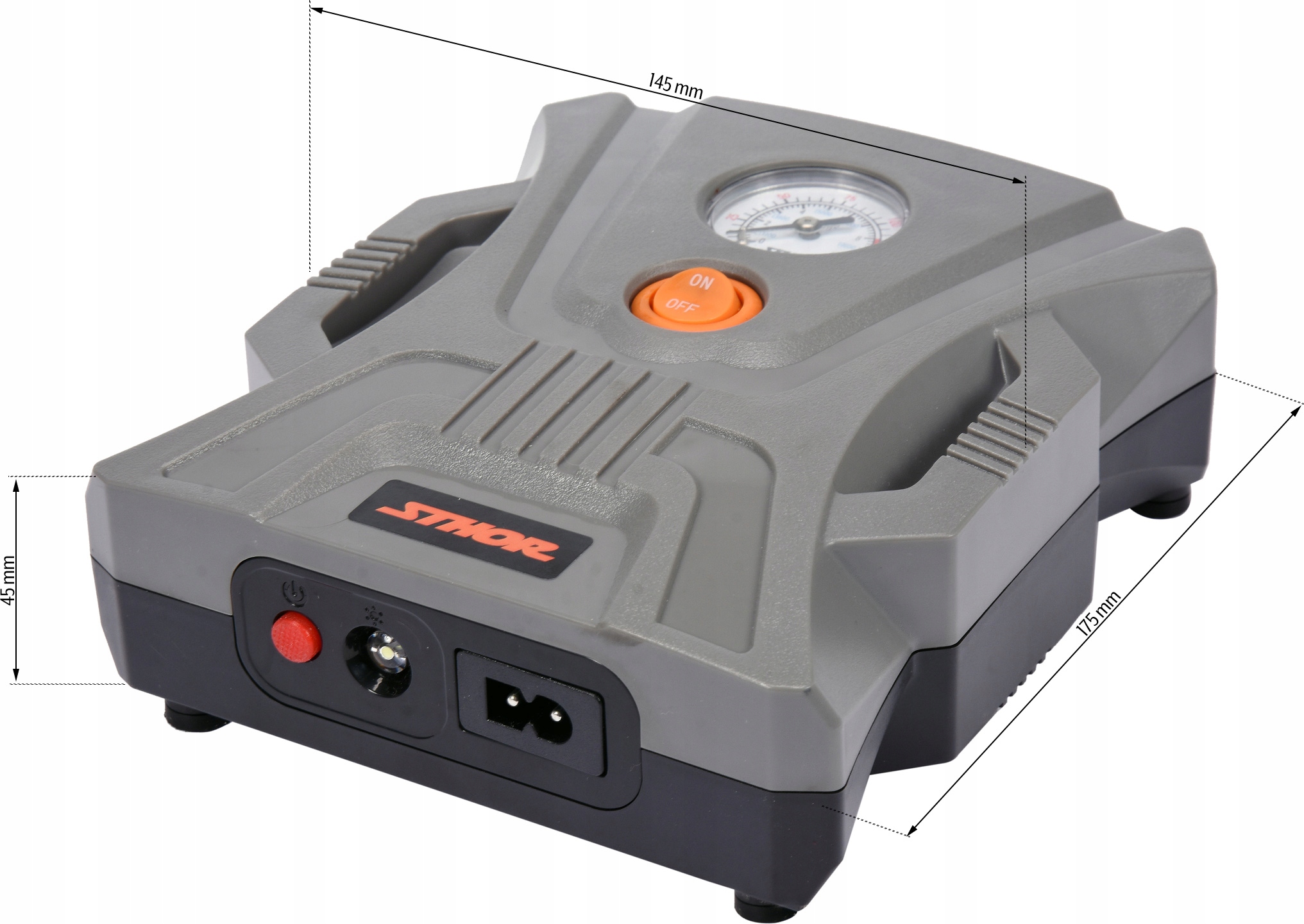 Компактний компресор з точним манометром з напругою живлення 12В. Призначений для накачування коліс і камер, оснащених клапаном, в автомобілях, мотоциклах і велосипедах, а також - зі змінними наконечниками - матраців, понтонів, м'ячів.