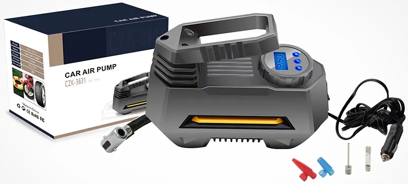 Автомобільний компресор — це інструмент, який використовується для накачування повітря в автомобільні шини. Він дуже корисний, коли вам потрібно швидко та легко накачати шини або коли у вас немає доступу до заправки з повітряним насосом. Пропонований автомобільний компресор невеликий і його легко носити, що дозволяє використовувати його в дорозі. Його також можна використовувати для інших цілей, наприклад, для надування матраців, м'ячів або надувного басейну (наконечники входять у комплект).