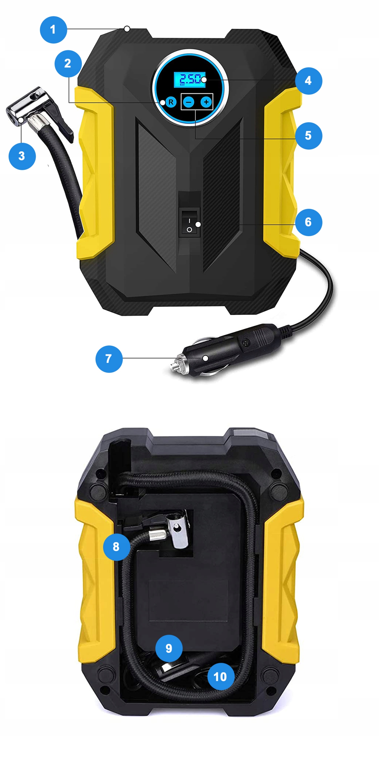 - Електронний манометр зі світлодіодним дисплеєм - вимикає компресор, коли встановлений тиск досягається.< /li>