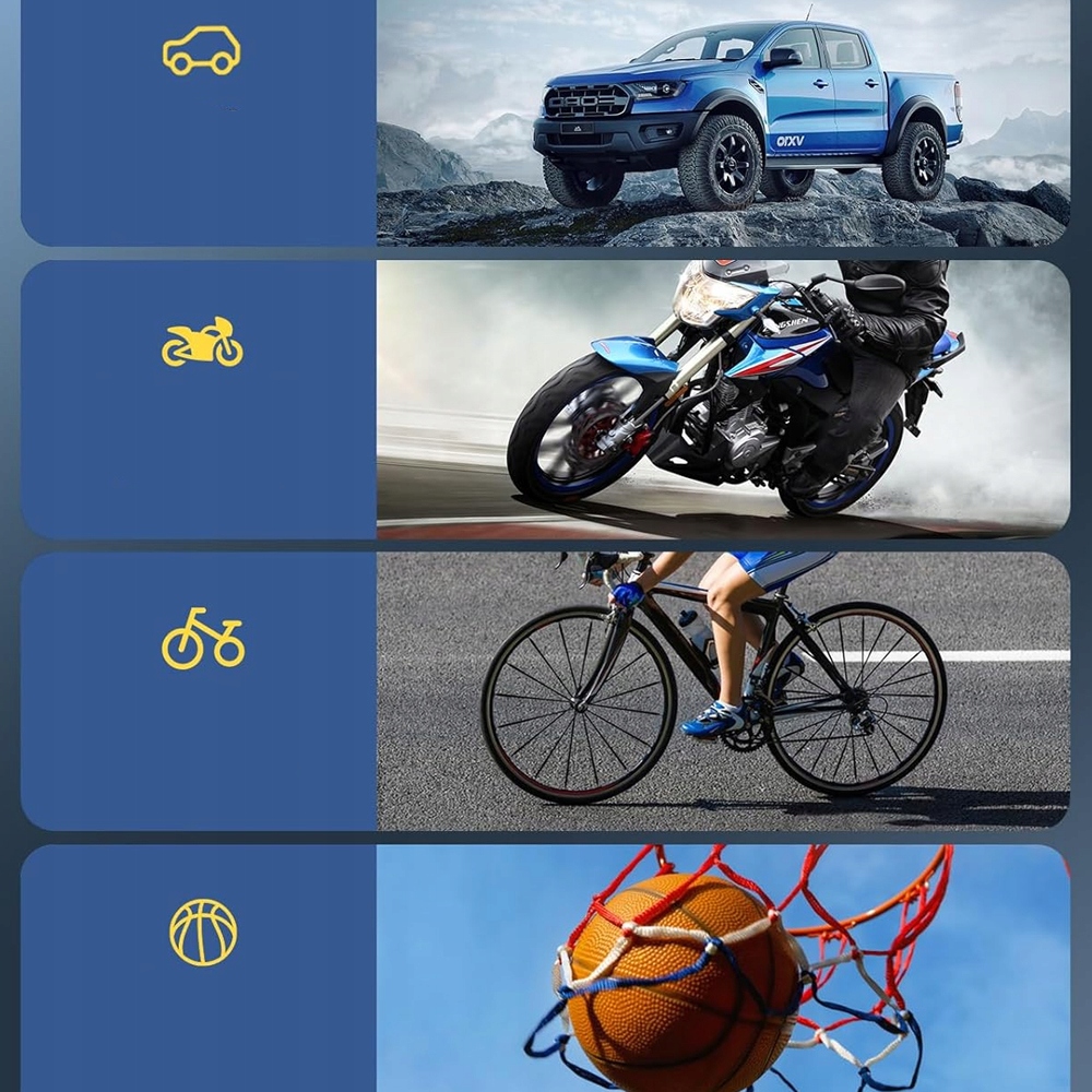 повітряний насос, оснащений ефективною системою та високим тиском 150 psi. Цей потужний повітряний компресор можна використовувати як зарядний пристрій на 4000 мАг, а також заряджати мобільний телефон. Простий у використанні: електричний насос простий у використанні, дуже підходить для накачування мотоциклів, велосипедів, автомобілів, ігор з м’ячем, плавальних кілець та інших надувних пристроїв.