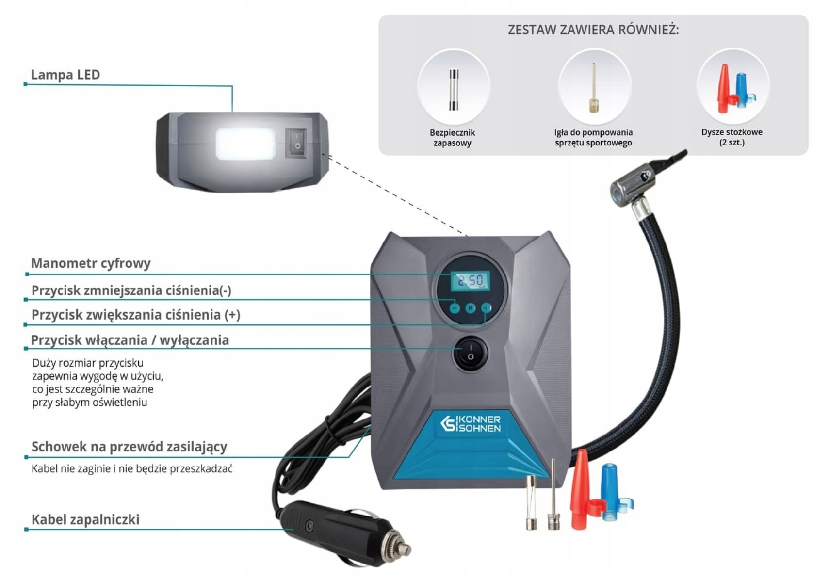 Автомобільний компресор KS P10 від Könner & Söhnen® є надійним помічником не тільки для водіїв автомобілів і велосипедистів, але він також призначений для рятувальних кругів, спортивного обладнання та інших надувних виробів. Процес відкачування займає всього кілька хвилин.