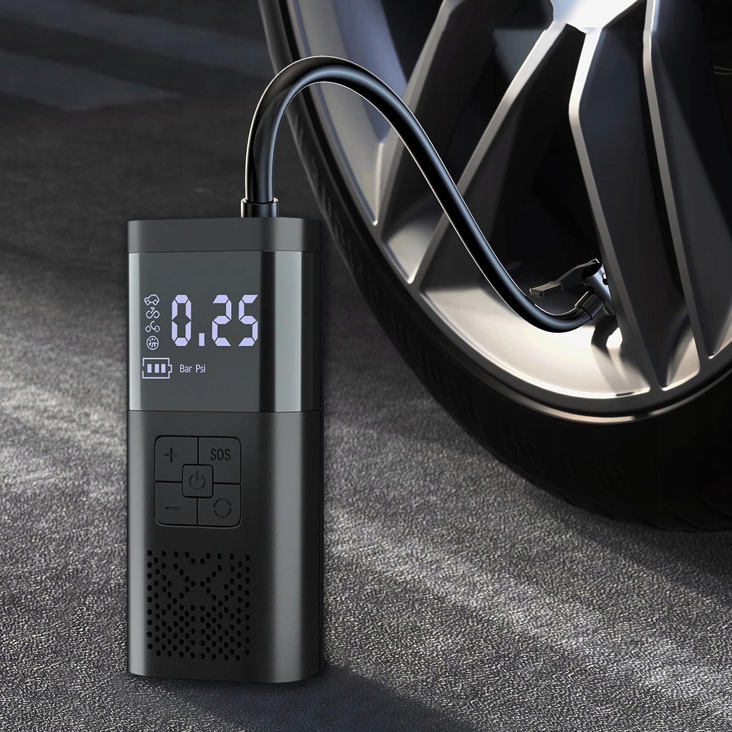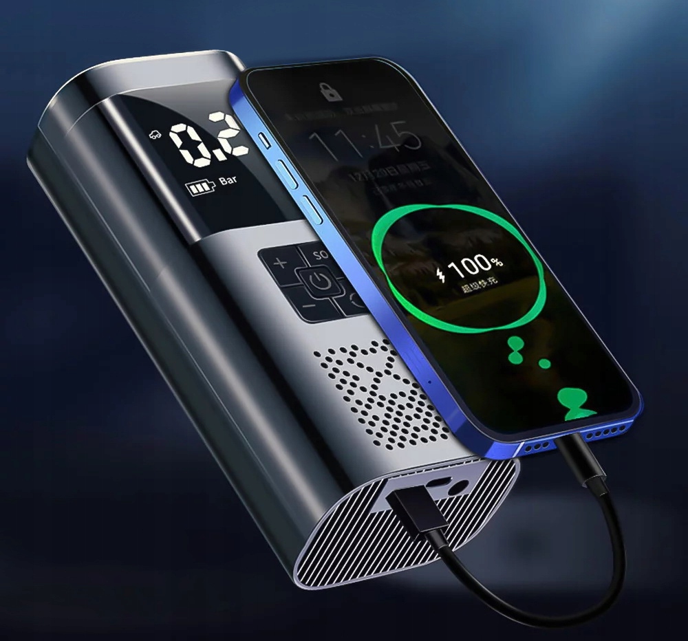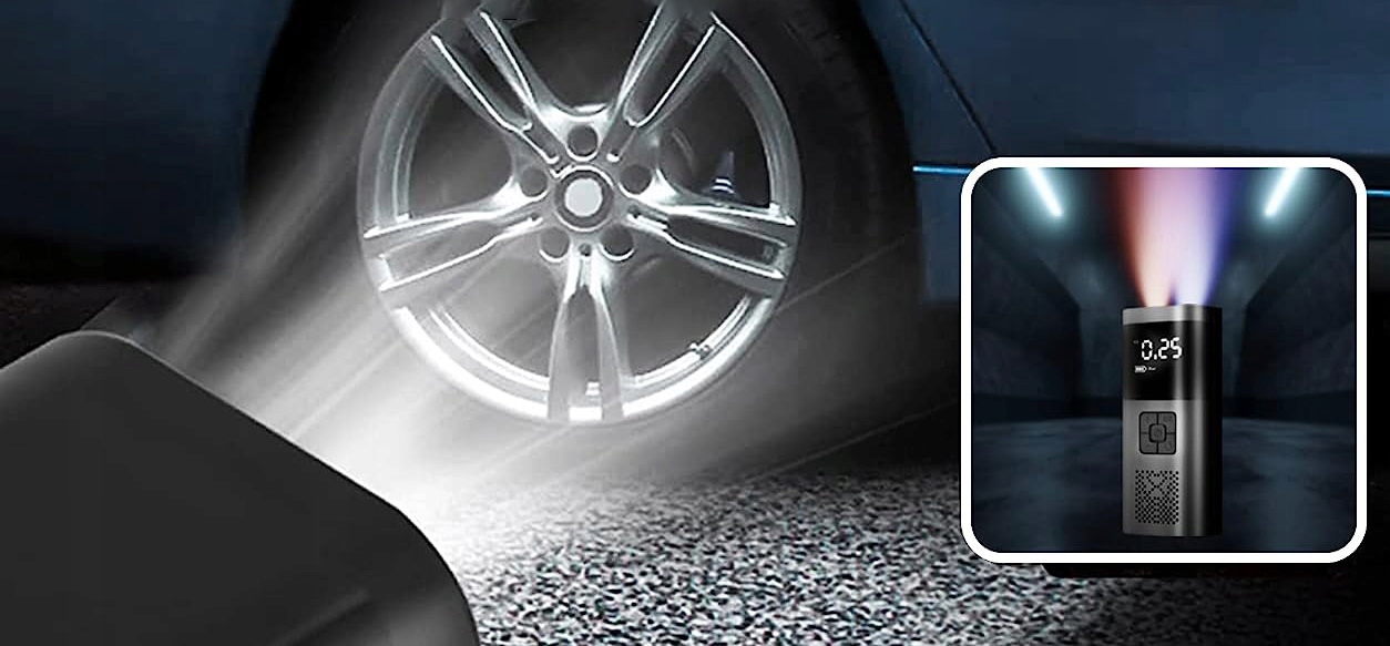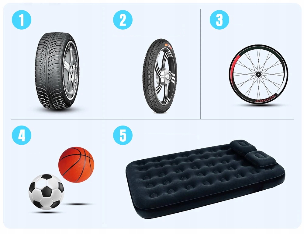 Портативний інтелектуальний компресор, компресор, компресор для накачування шин для автомобілів, велосипедів, мотоциклів, квадроциклів, електросамокатів, інвалідних колясок, баскетбольних м’ячів, футбольних м’ячів, надувних матраців та багатьох інших пристроїв завдяки використанню пакету допоміжних насадок.
