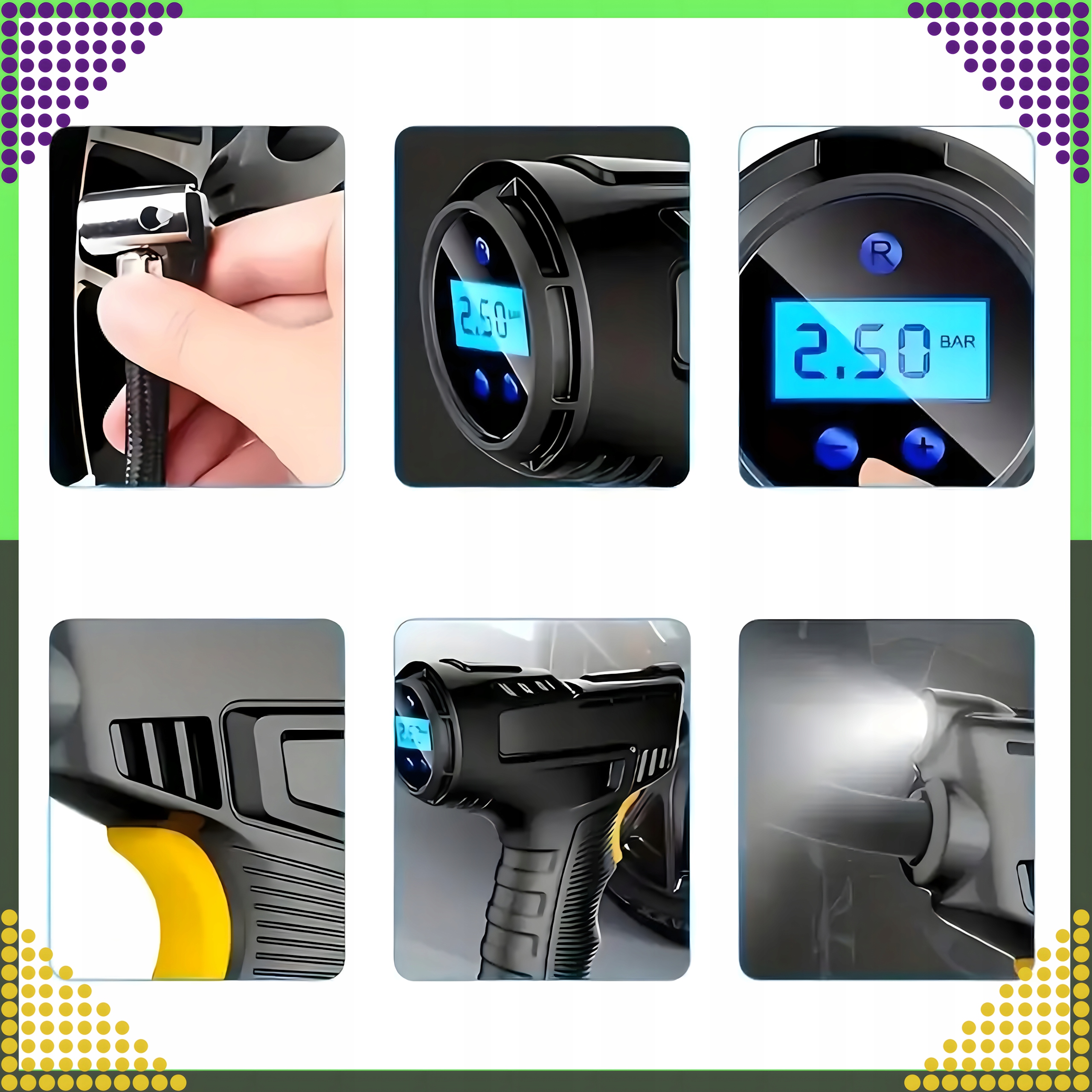 ⭐ Ви витягуєте компактний компресор 120w/150psi одним рухом одним рухом, ви підключаєтесь до гніздо 12v , ви встановлюєте потрібний тиск на чіткий lcd , мудрий шина.