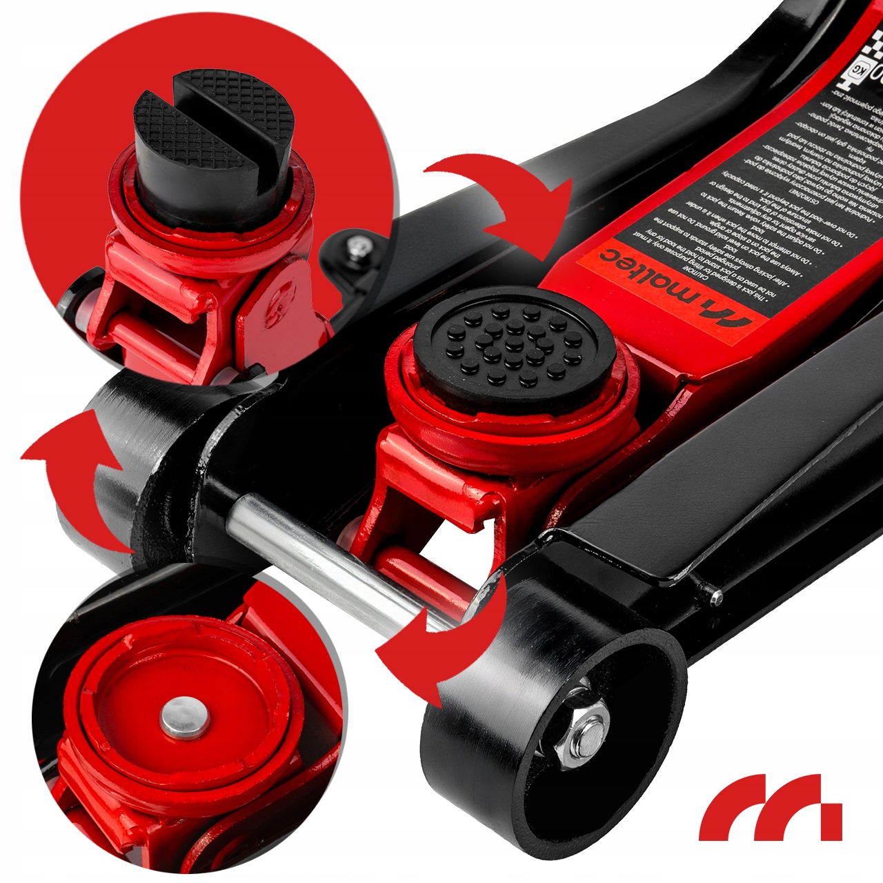 Підйомник оснащений поворотними,несучимипередніми колесами, що дозволяє легко маневрувати. Ці колеса гарантують плавний рух домкрата, що дозволяє точно розташувати його в потрібному положенні під автомобілем. Стійкість під час підйому та опускання автомобіля є ключовою функцією, яка підвищує безпеку роботи.