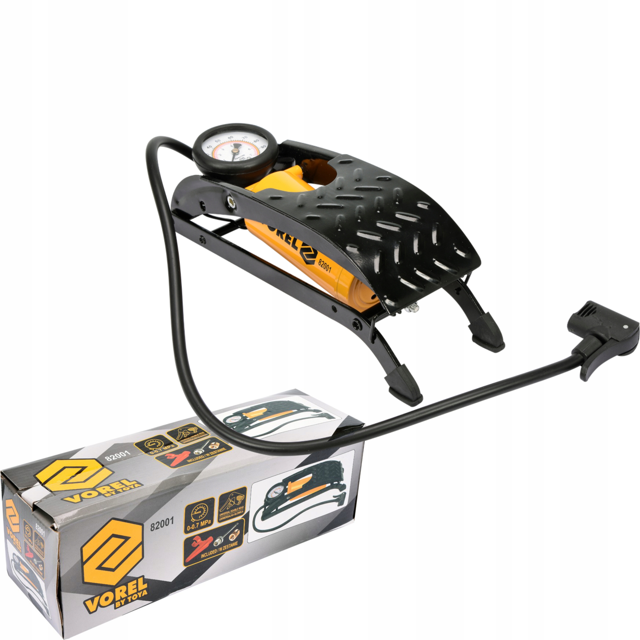 Однопоршневий ножний насос із манометром. Виготовлений з металевого гнучкого шланга з універсальним наконечником, що дозволяє накачувати як автомобільні, так і велосипедні клапани. Манометр відградуйований до 7 БАР. У набір також входять універсальні наконечники для надування м'ячів, матраців і т.д.