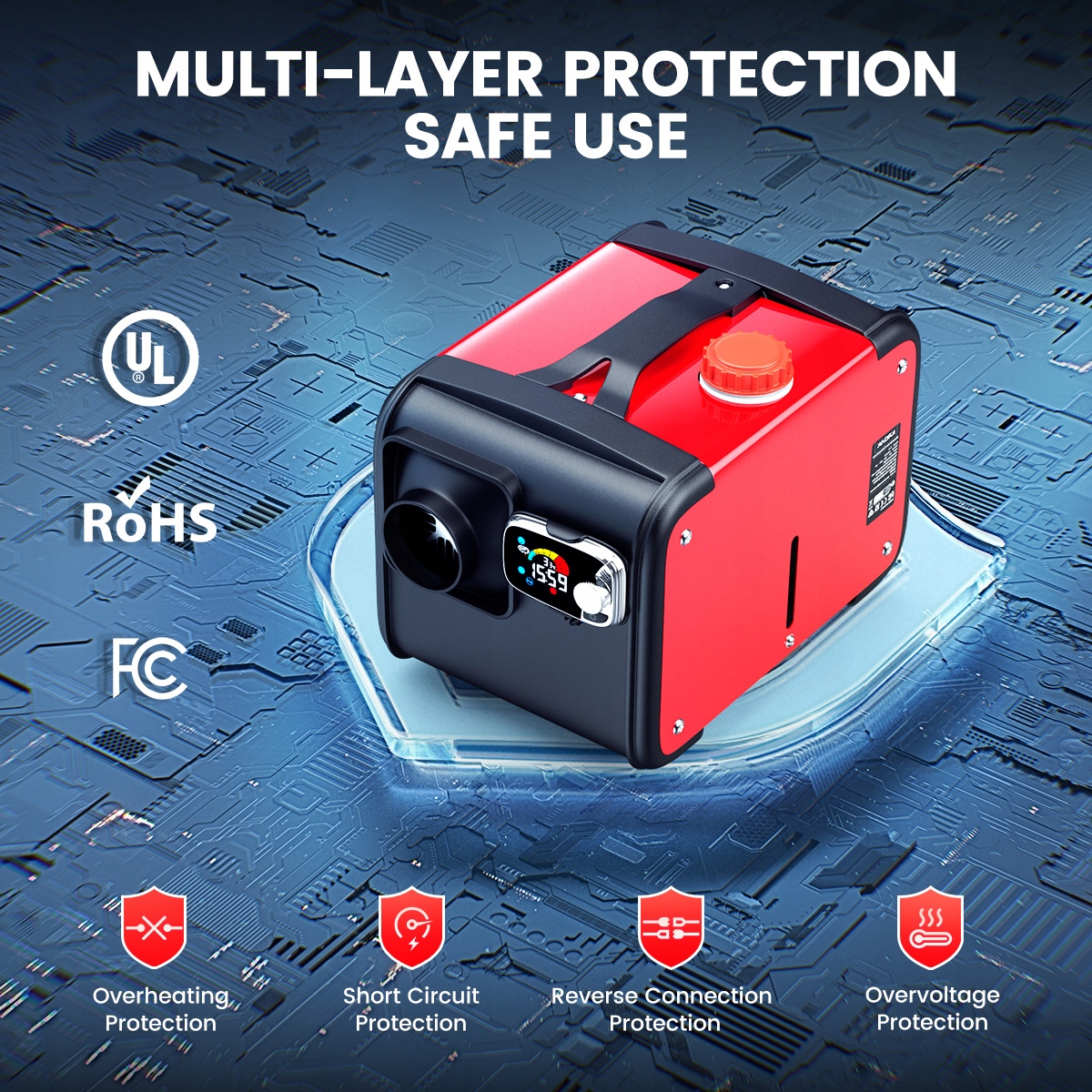 【БЕЗПЕКА】 Головна плата обігрівача має захист від короткого замикання, зворотної полярності, перенапруги, перегріву та багато іншого. Це робить його безпечним для використання в різних середовищах, зокрема в автомобілях, кемперах, човнах і в приміщеннях.