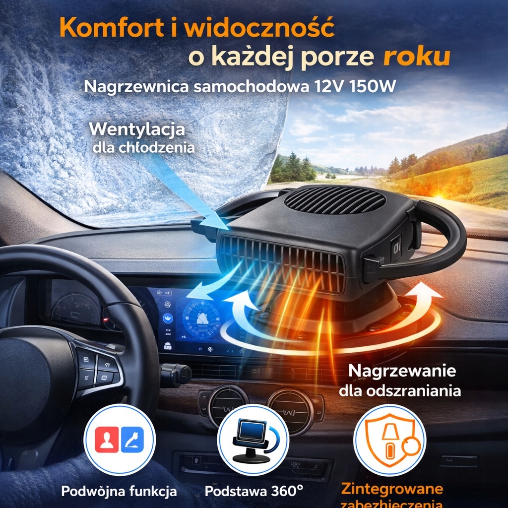 Обертайте вентилятор на 360° і направляйте тепло саме туди, куди вам потрібно – на руки чи вікна. Комфортна зимова їзда всього за кілька секунд!
