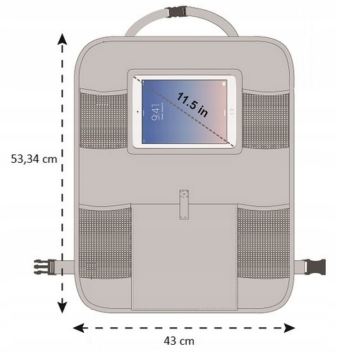 Завдяки універсальному кріпленню сидіння воно підходить майже до будь-якого автомобіля. Окрім кишені для планшета, органайзер містить 4 сітчасті кишені та широку середню кишеню. Нижні кишеньки призначені для пляшок, верхні - менші кишені для різних дрібниць. У середню кишеню можна вмістити кілька іграшок або інших предметів.