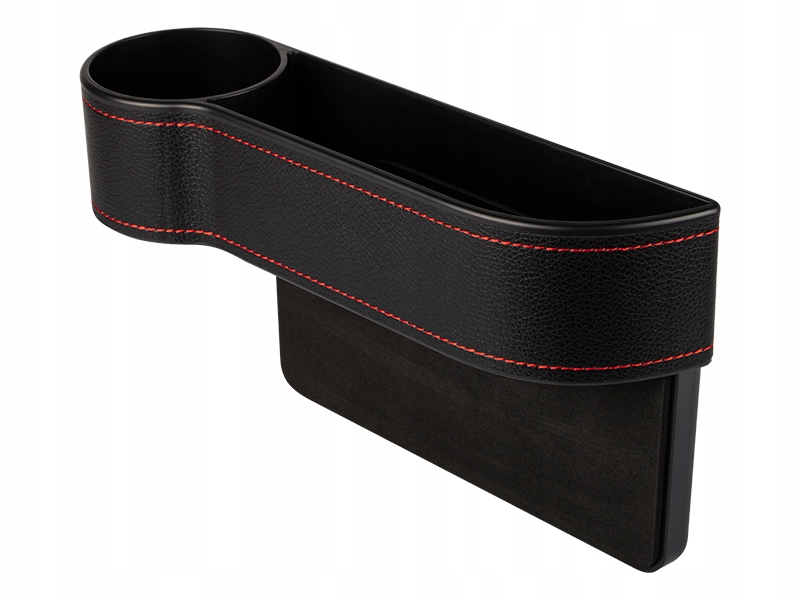 Автомобільний відсік із відділеннями та підстаканником, призначений для встановлення між сидінням водія та коробкою передач. Виключно приємна чорна оббивка гарантує, що виріб впишеться в будь-який салон автомобіля, а червона нитка підкреслює унікальний і сучасний дизайн. У передній частині є підставка для напоїв (чашка, склянка, банка або пляшка).