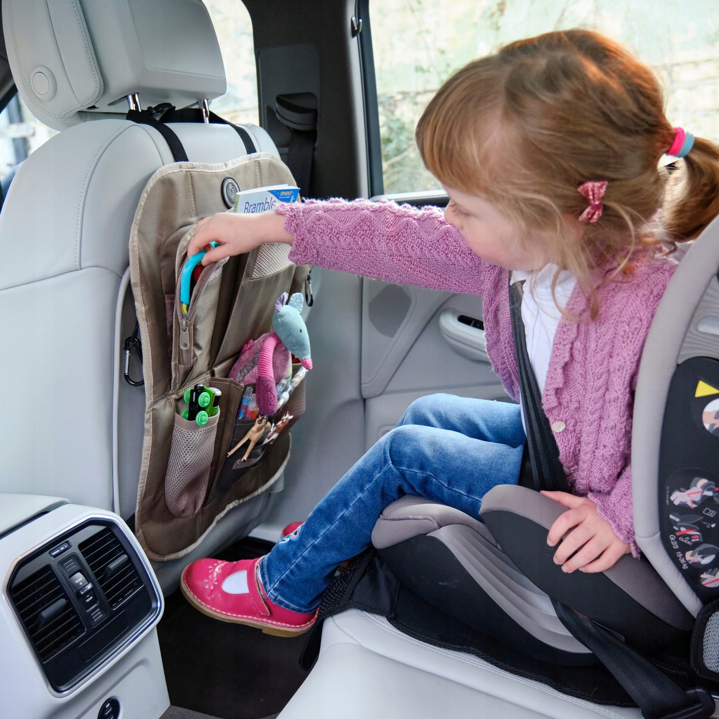 Це корисно для зберігання іграшок, книг, пляшок для напоїв і дозволяє тримати речі вашої дитини в порядку під час подорожі. З боків органайзер має два практичних гачка, на які можна кріпити іграшки. Захисний килимок з органайзером також використовується для захисту спинки автокрісла від забруднення.