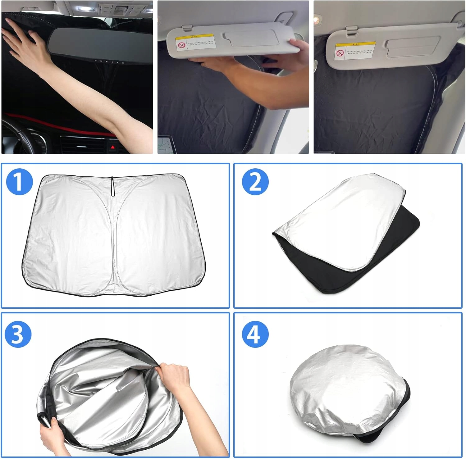Складений і простий у використанні наш сонцезахисний крем на передньому склі складений і постачається з мішком, який можна легко зберігати в машині. Щоб скористатися ним, просто вийміть кришку з сумки, розкладіть її і покладіть на лобове скло.